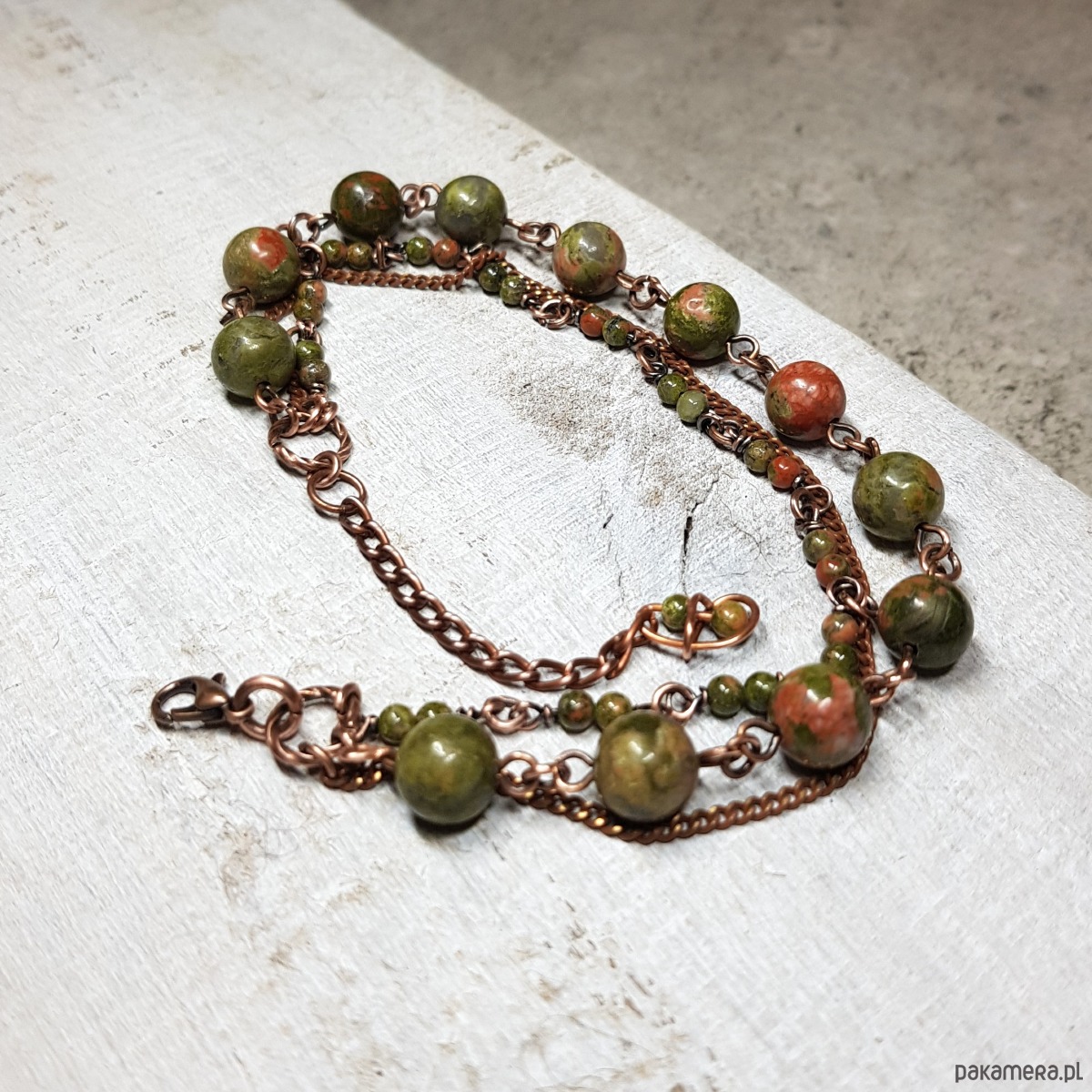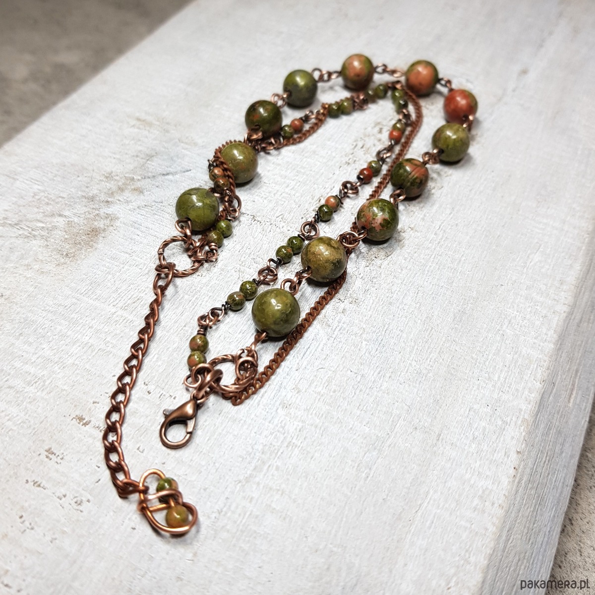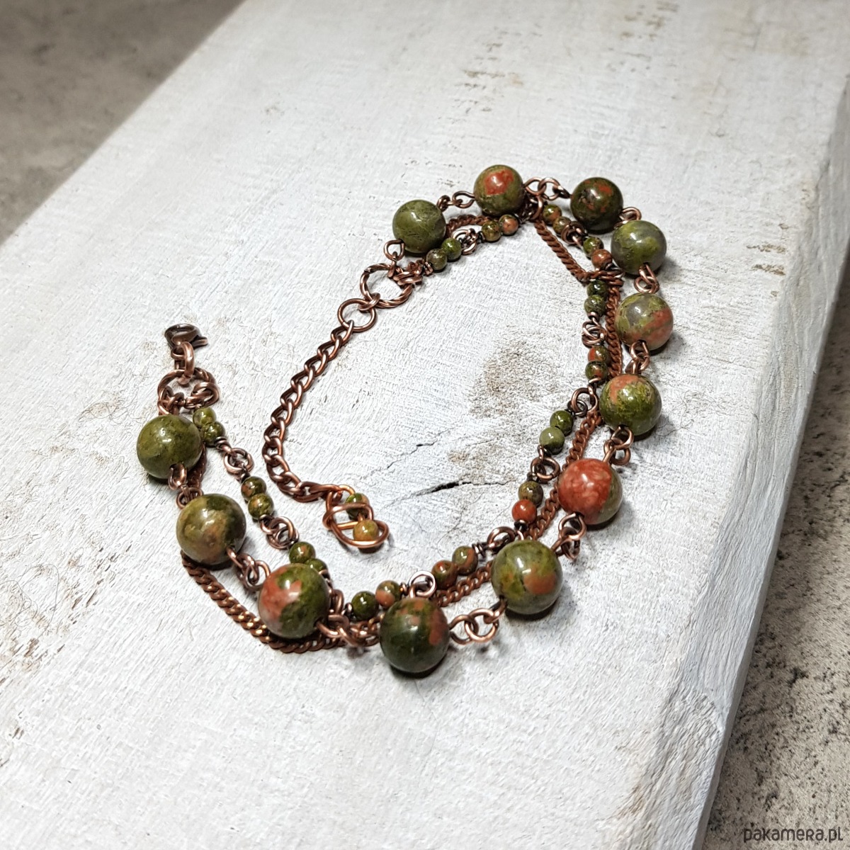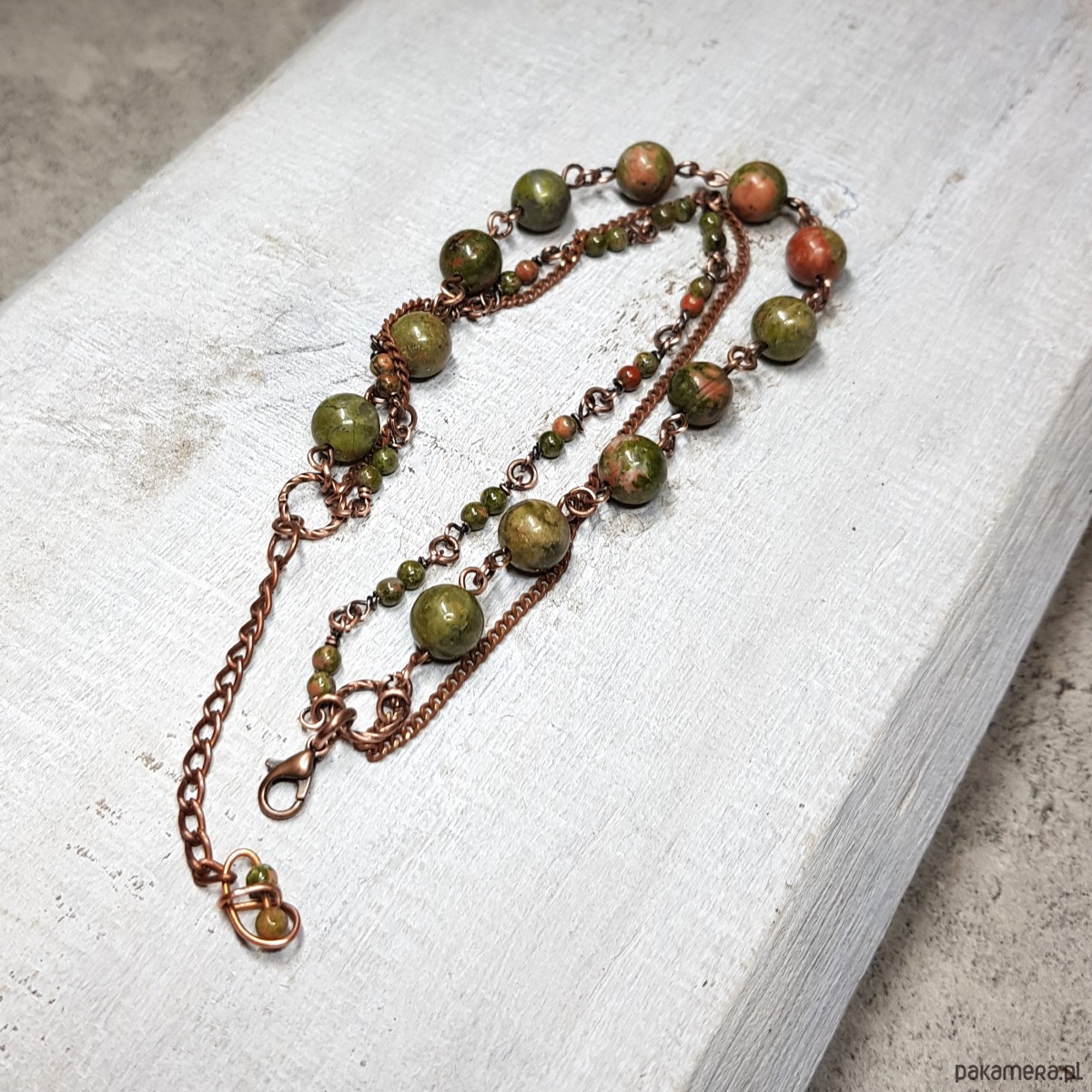 bransoletka wykonana ręcznie w miedzi metodą wire-wrappingu z naturalnych koralików (8mm i 3mm) unakitu, następnie oksydowana i wypolerowana. Długość bransoletki 21 plus 4cm. Całość bardzo spokojna, elegancka, wizytowa, jednocześnie dzięki soczystej zieleni z delikatnymi przebłyskami różu jest radosna, jakby budząca się do życia.