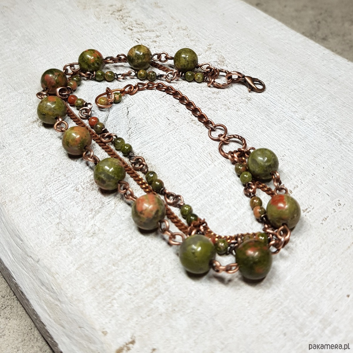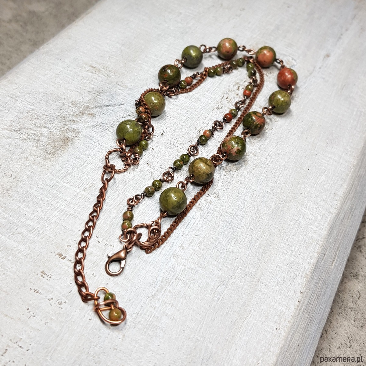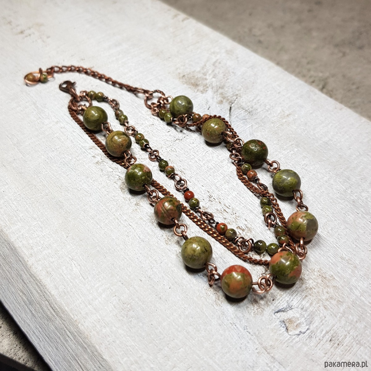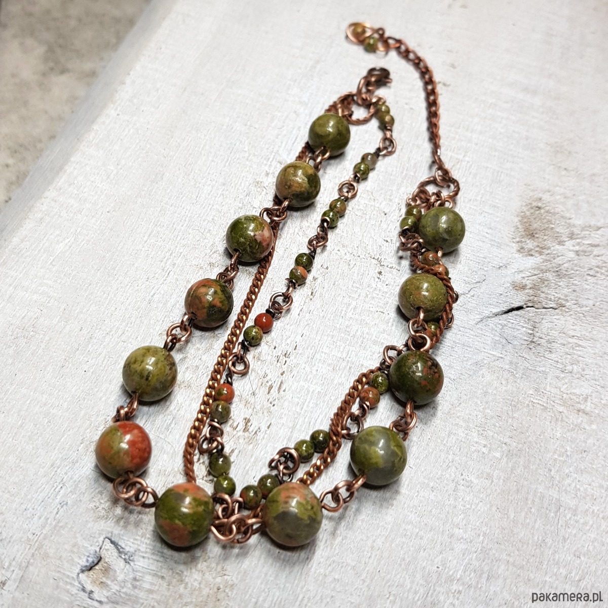 bransoletka wykonana ręcznie w miedzi metodą wire-wrappingu z naturalnych koralików (8mm i 3mm) unakitu, następnie oksydowana i wypolerowana. Długość bransoletki 21 plus 4cm. Całość bardzo spokojna, elegancka, wizytowa, jednocześnie dzięki soczystej zieleni z delikatnymi przebłyskami różu jest radosna, jakby budząca się do życia.