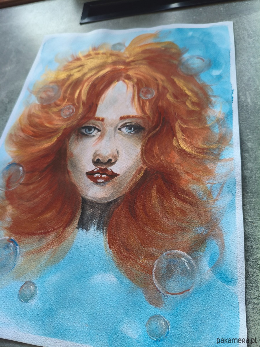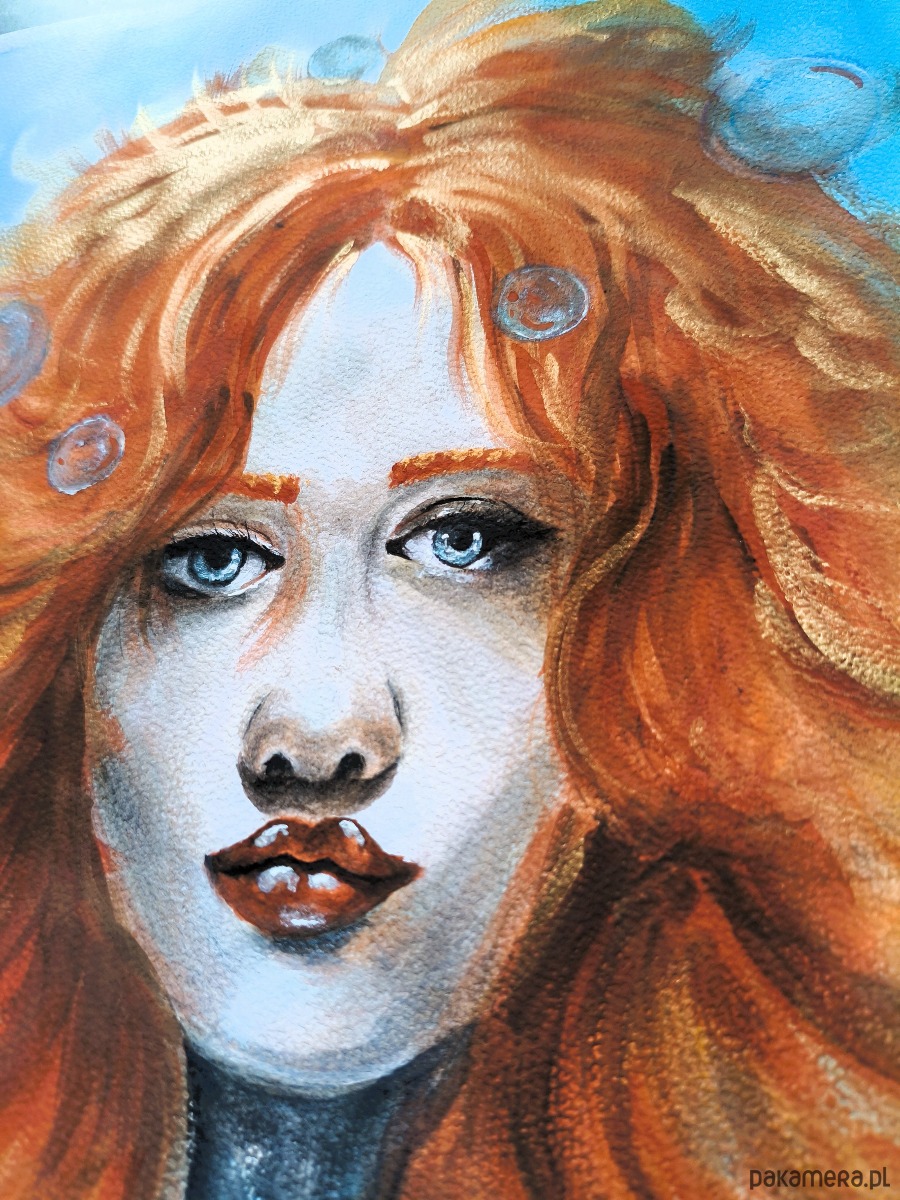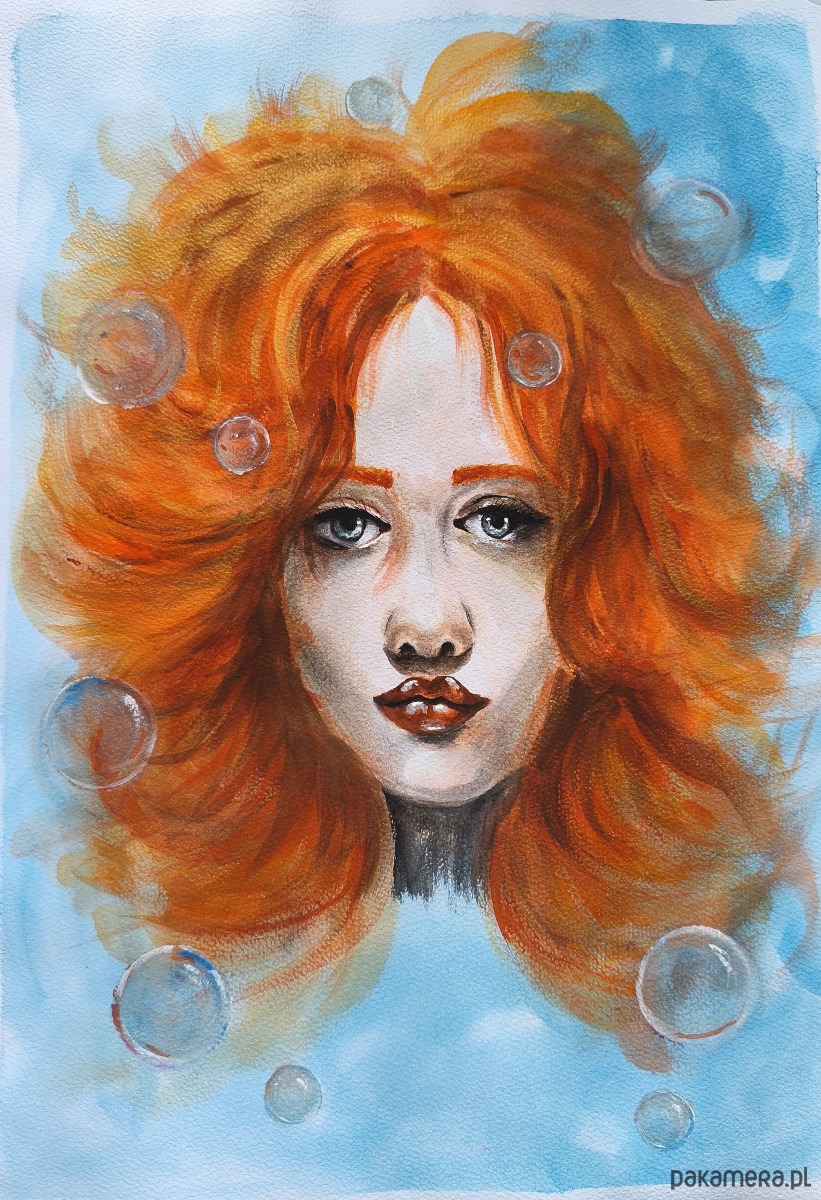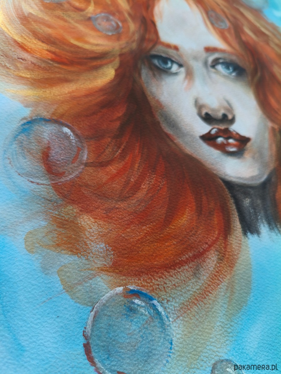"Under the sea" to magiczny portret rudowłosej kobiety (Syrenki), natchniony nieśmiertelną Arielką. Obraz uchwyca intensywną, niemal smutną intymność spojrzenia, otoczoną wibrującą, ognistą czerwienią włosów - kontrastującą z chłodnym, błękitnym tłem podwodnego świata.