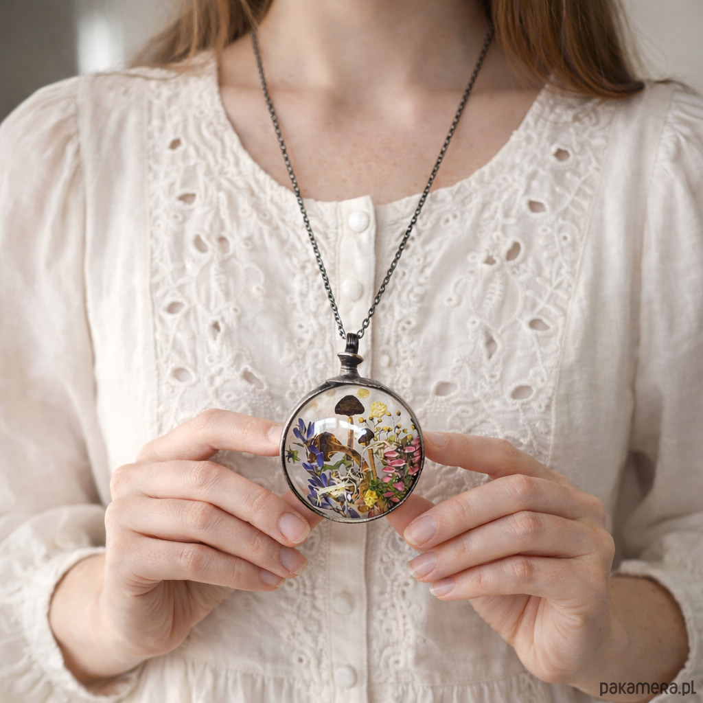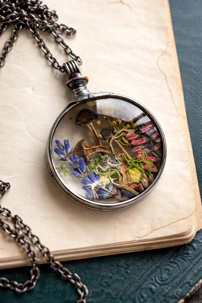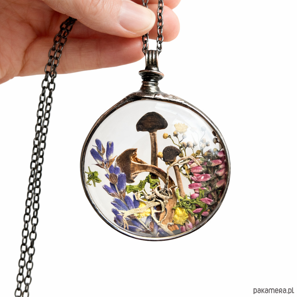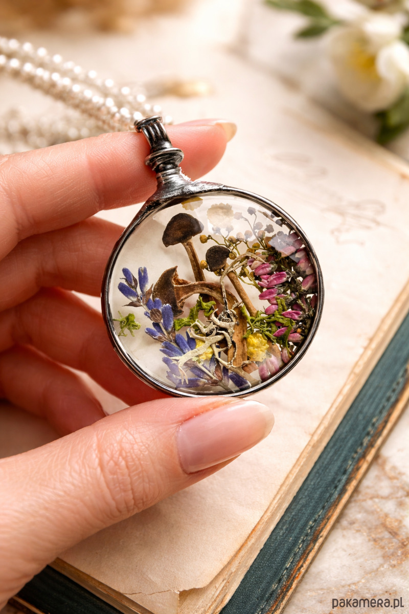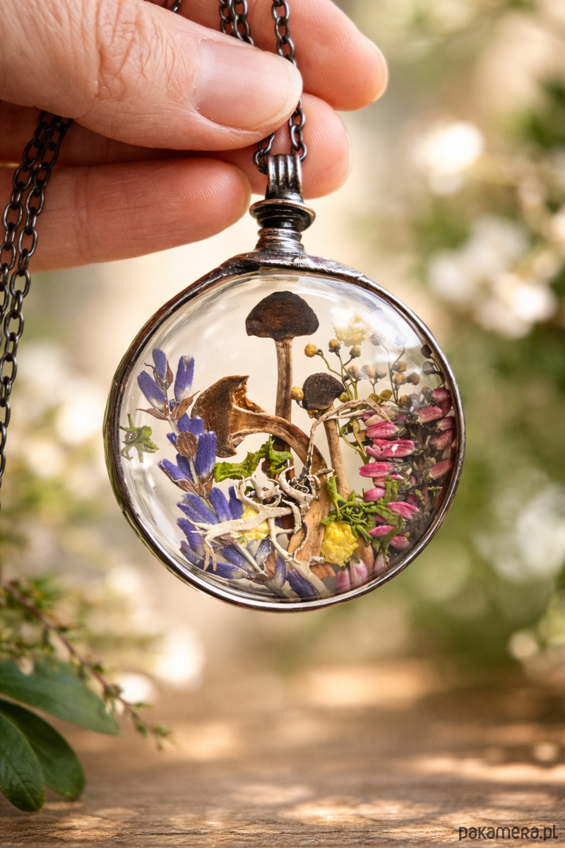 Okrągły wisiorek z naturalną kompozycją roślinną – suszone grzybki, lawenda i drobne leśne rośliny zostały zamknięte pomiędzy taflami szkła, tworząc małe roślinne terrarium.
