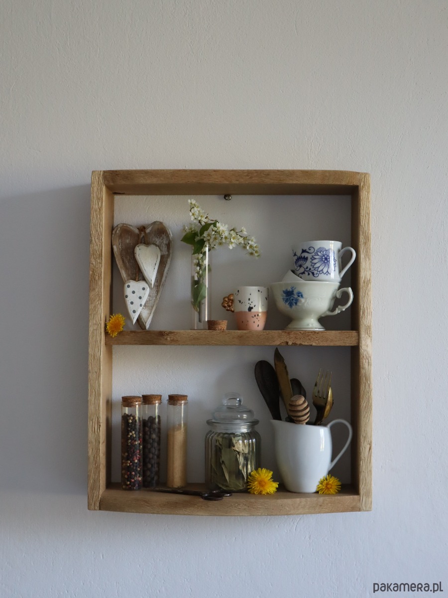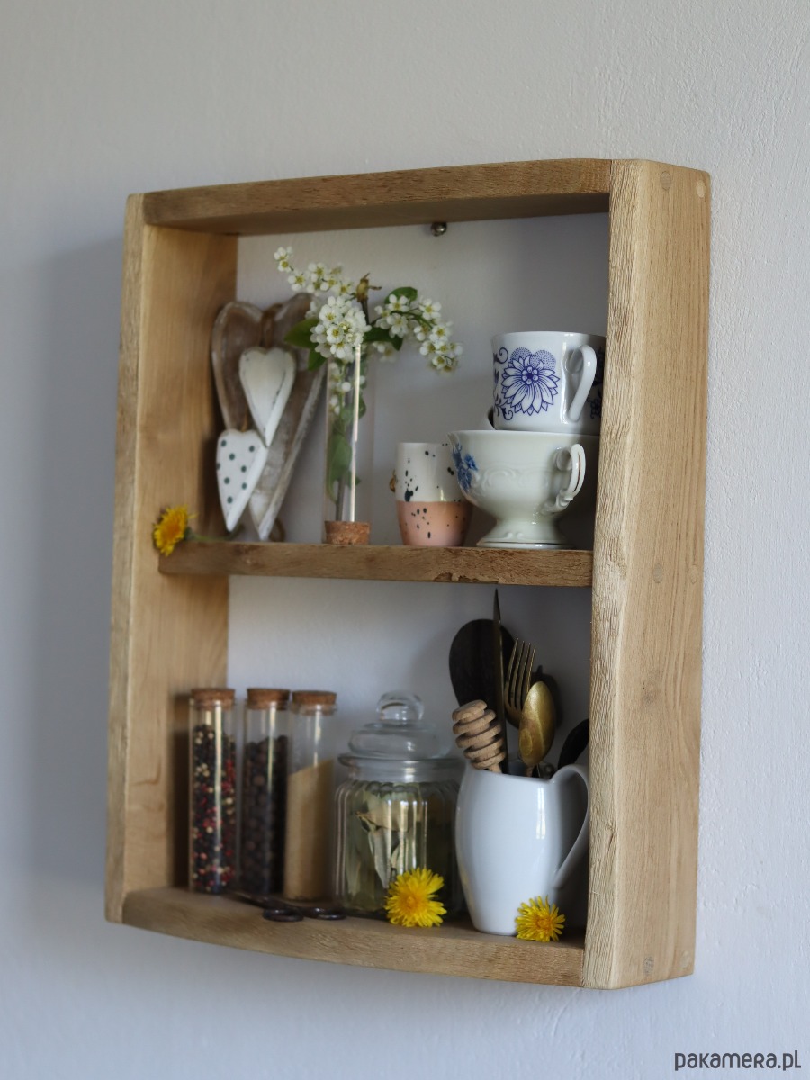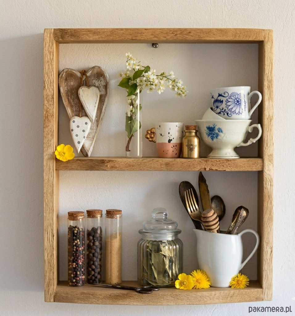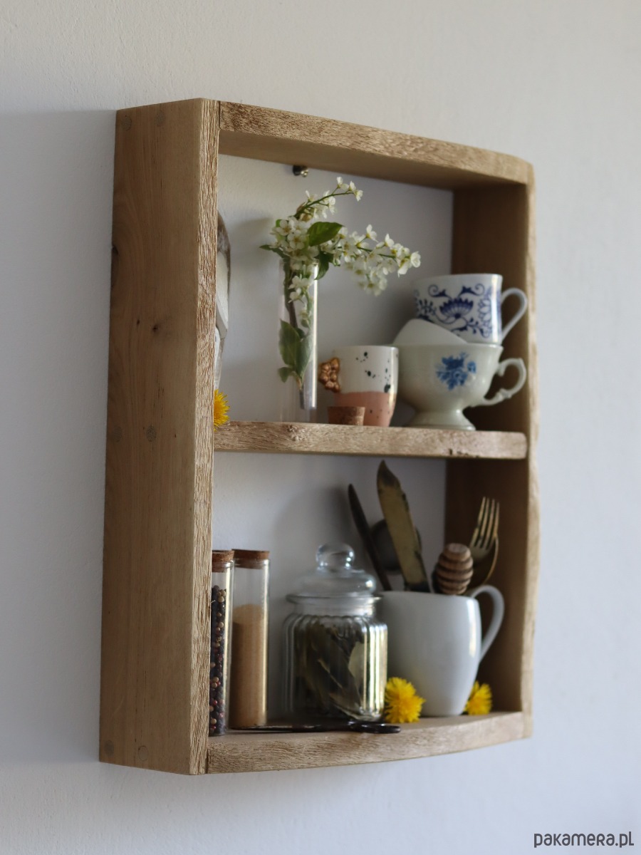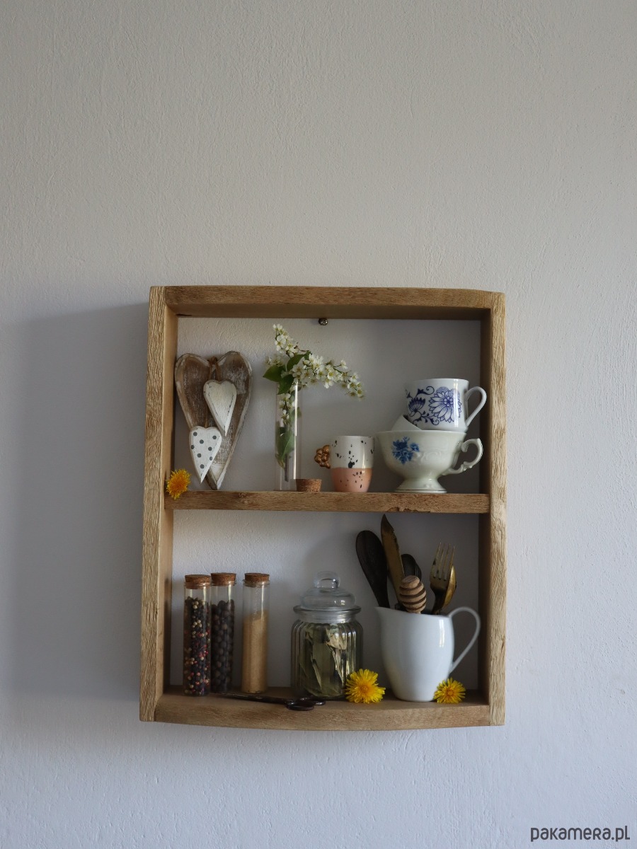 Półka na przyprawy w kuchni, dodając jej naturalnego uroku.