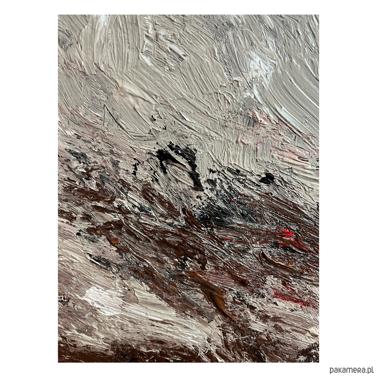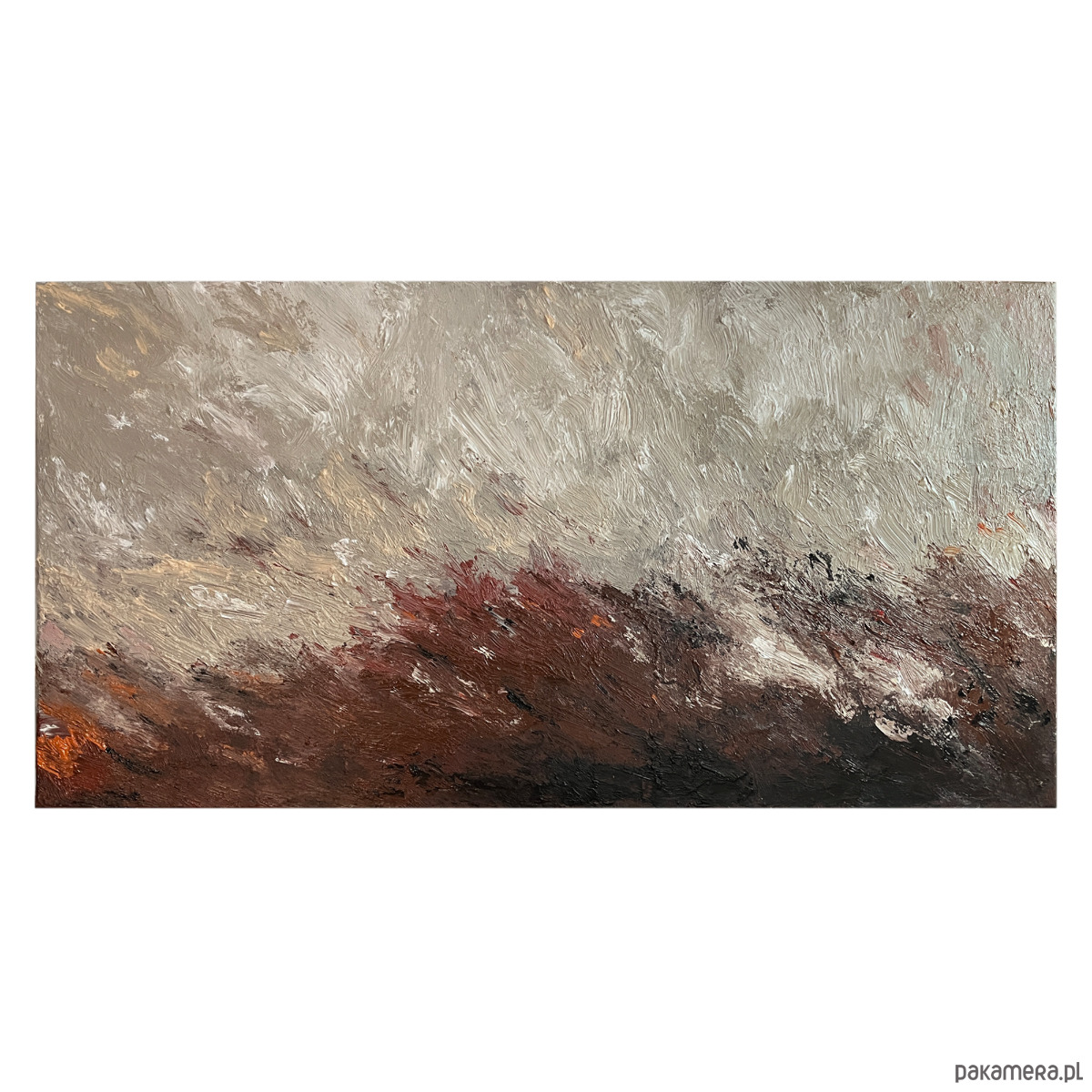 Abstrakcyjny pejzaż z wyraźnie widocznymi pociągnięciami pędzla i zaznaczoną fakturą. Spokojna kolorystyka w odcieniach beżu i brązu.