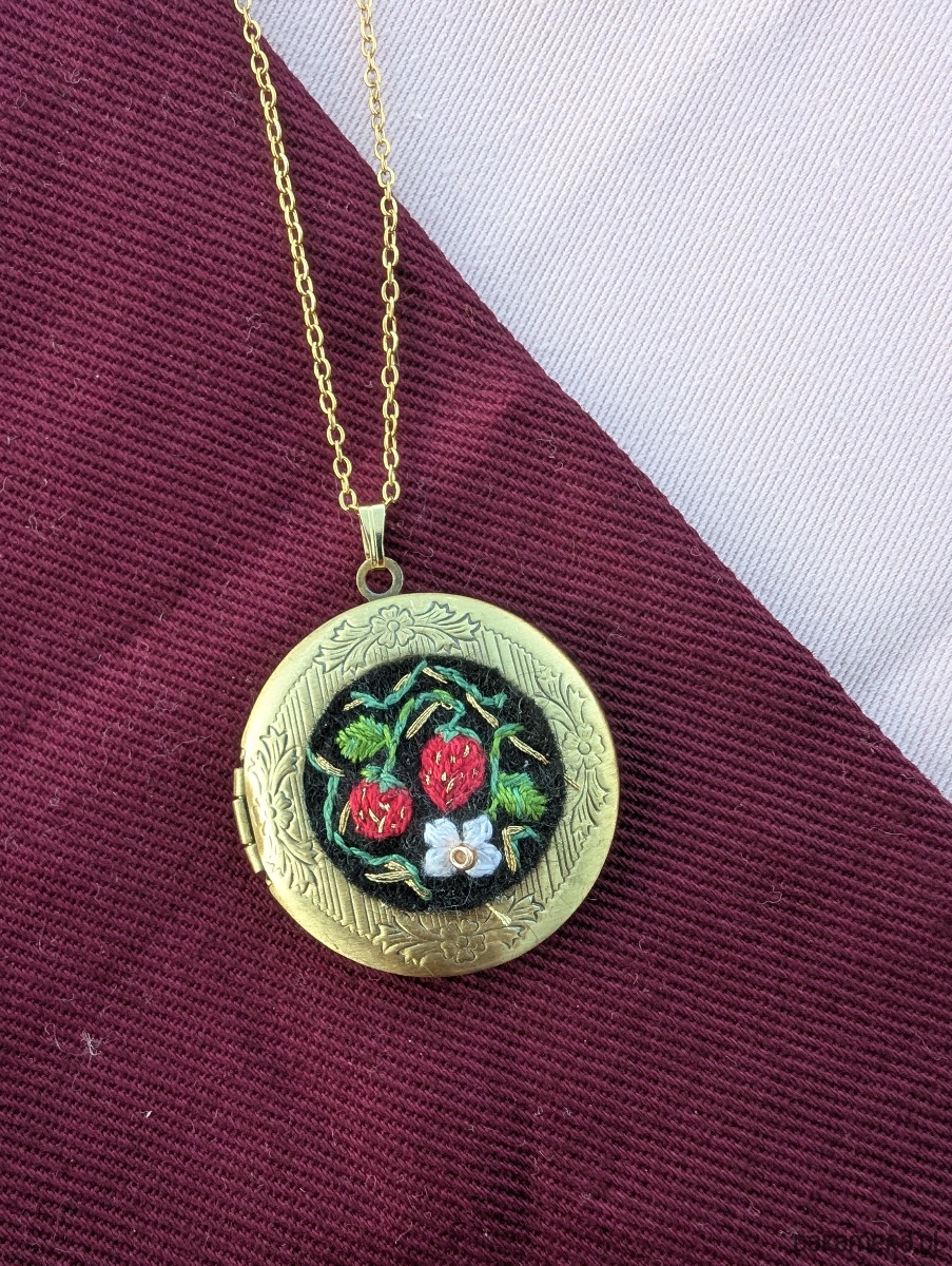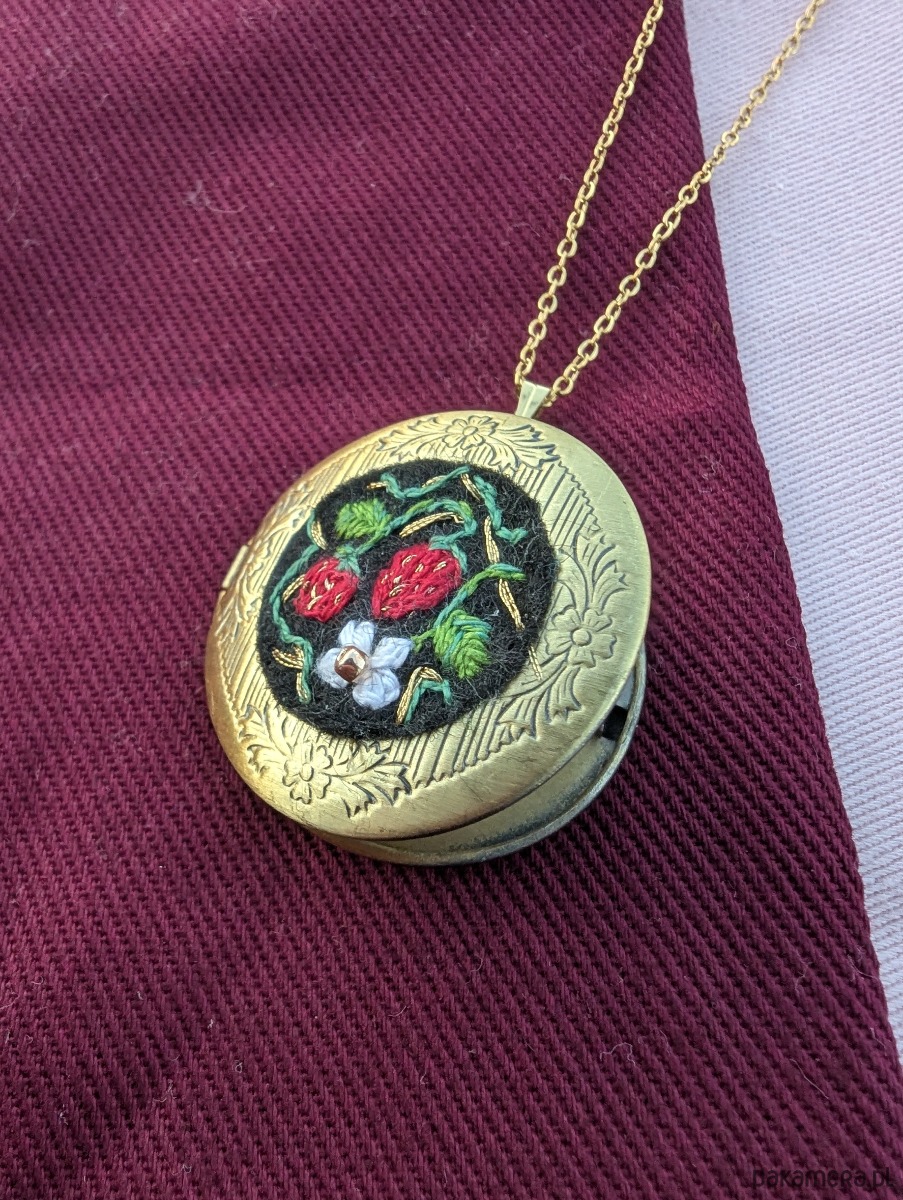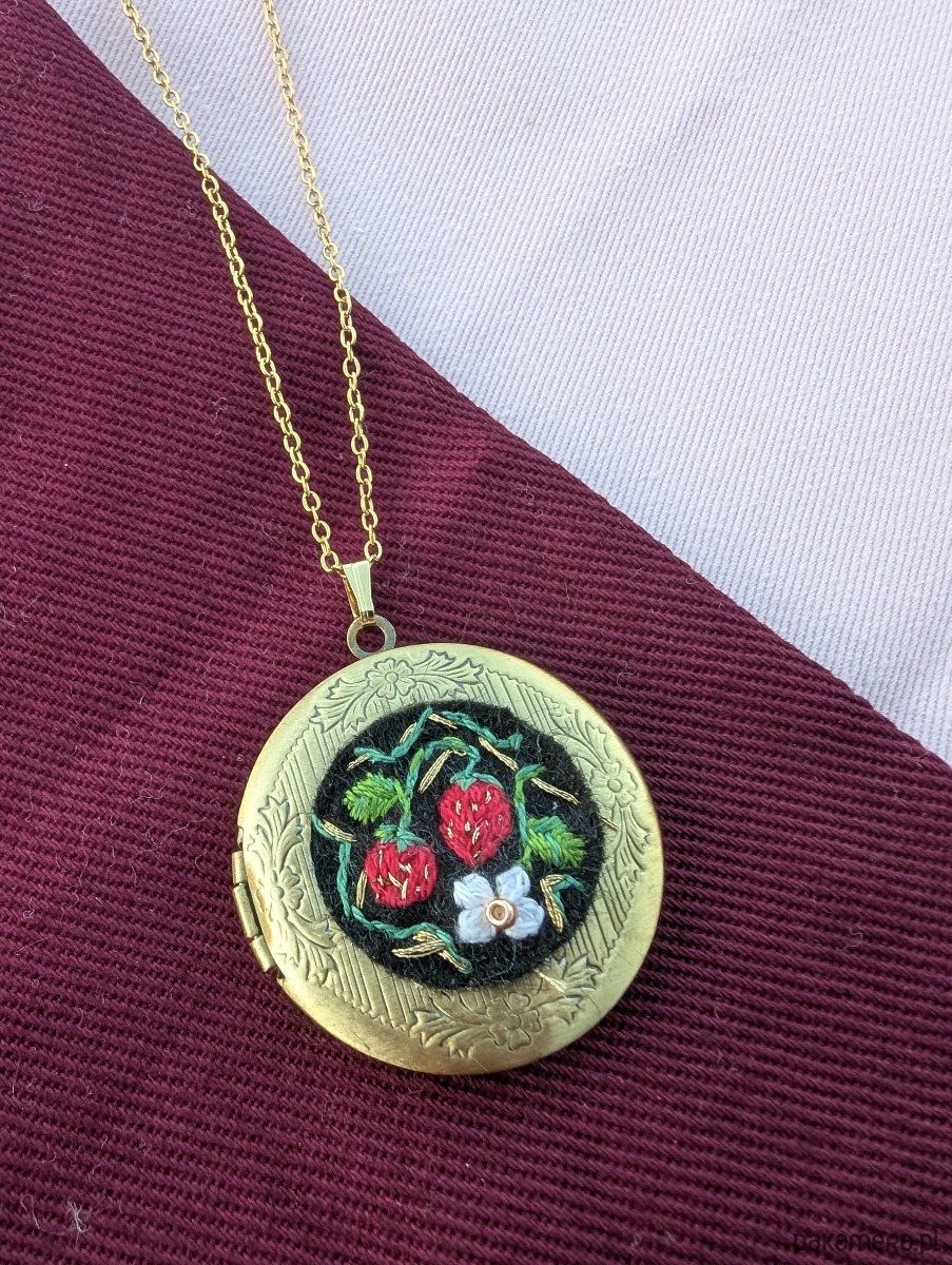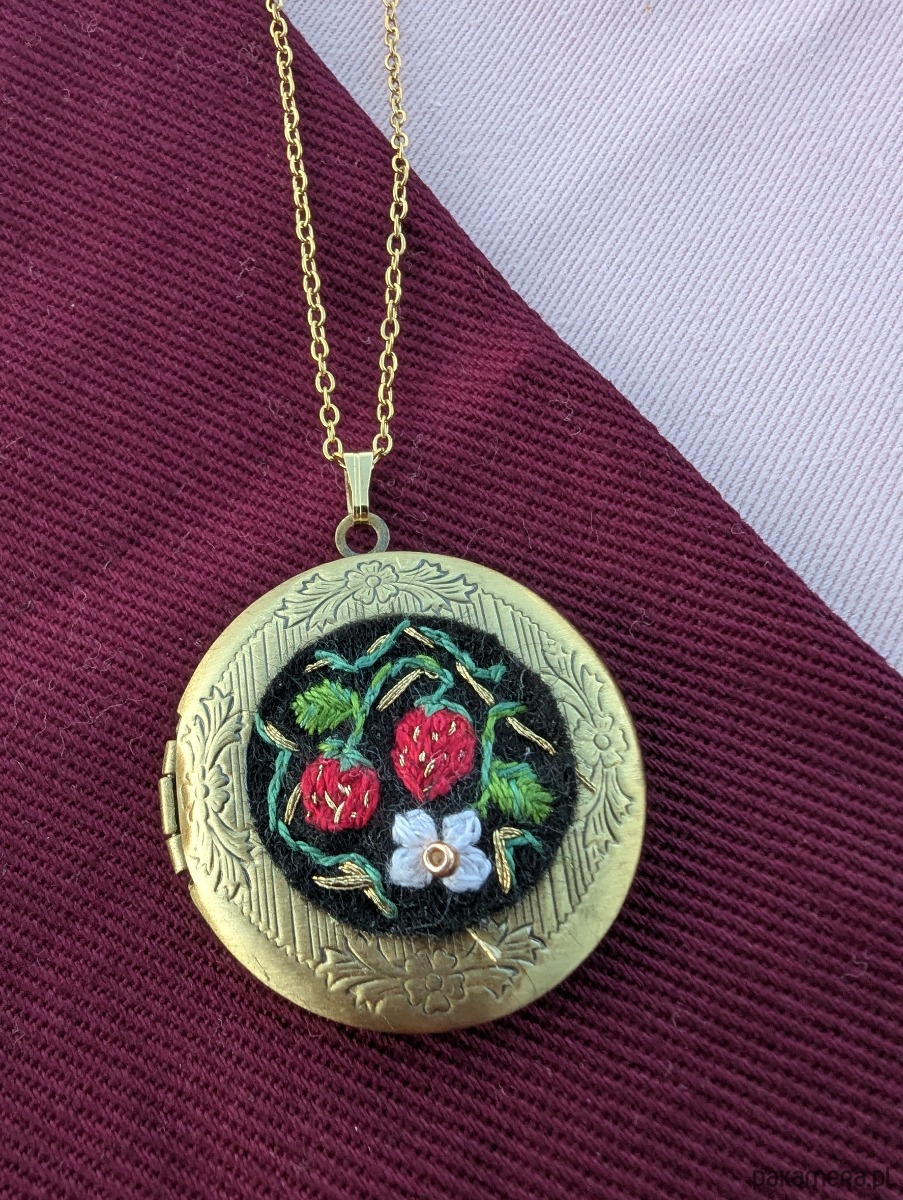 Ten okrągły sekretnik ozdobiłam maleńkim, ręcznie wykonanym haftem poziomek - drobnych, czerwonych owoców i białego kwiatu, którego środek tworzy błyszczący złoty koralik. Całość wyszyłam delikatną złotą nitką, która nadaje projektowi elegancji i subtelnego blasku.