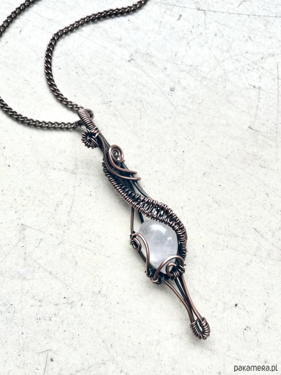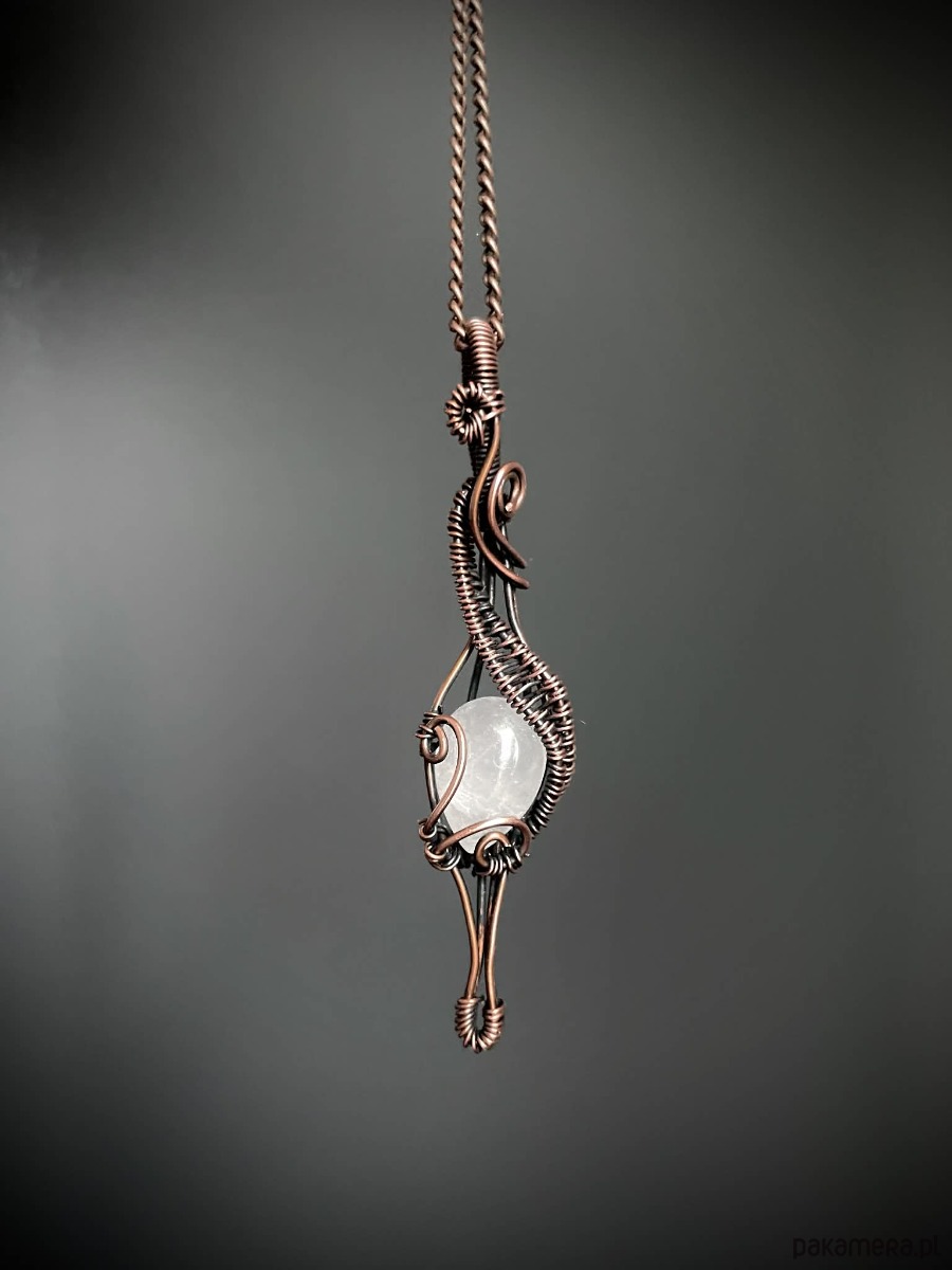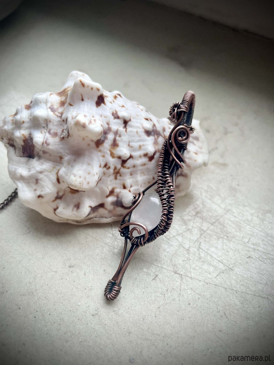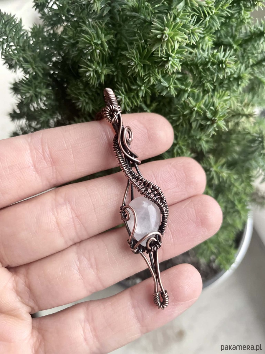 Unikalny elegancki wisiorek z kwarcem różowym, który przeniesie Cię do magicznego lasu elfów. Wysokość ozdoby to 6,4 cm. Świetnie nadaje się za równo na co dzień jak i na specjalne okazje np. na ślub czy wesele. Ozdoba opleciona miedzią po oksydacji (postarzana) oraz szlifowaniu. Nie drapie i jest komfortowa w noszeniu.