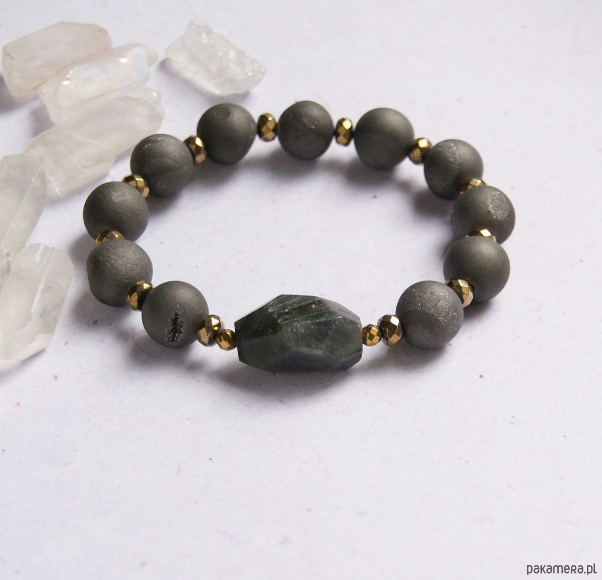 cudna bransoletka wykonana z dużych, matowych kul MATOWEGO agatu druzy POKRYTEGO TYTANEM (12mm) unikatowej, ciosanej bryłki labradorytu(ok.23mm).; przekładki to oponki fasetowanego złotego hematytu.