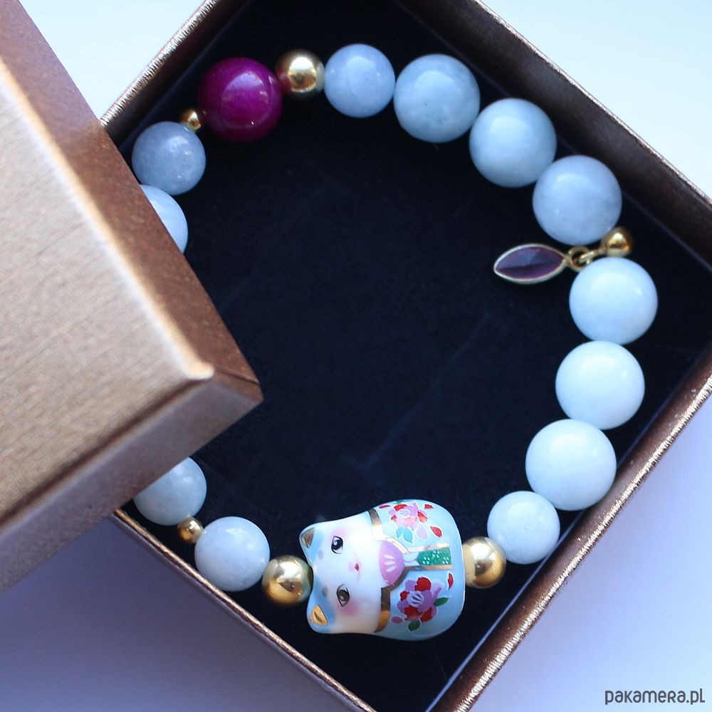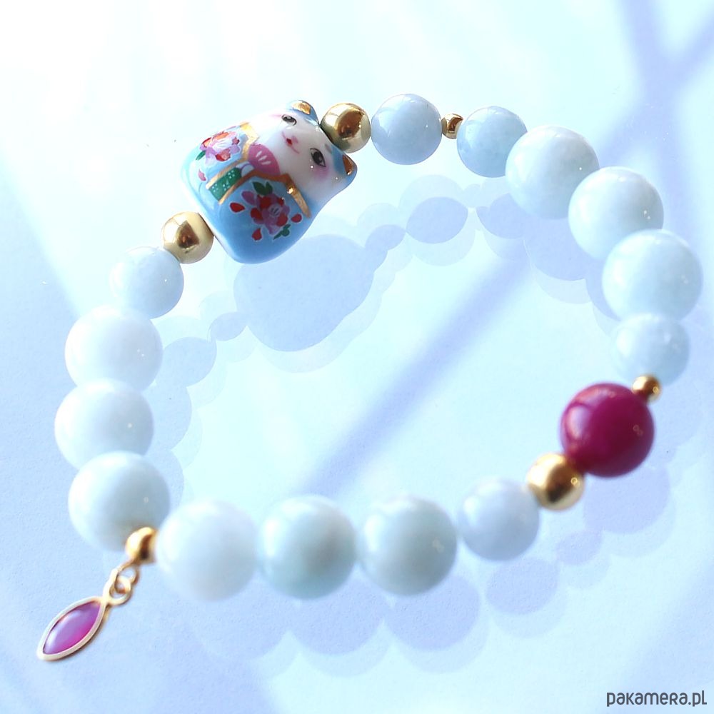 Energetyczna bransoletka z akwamarynem, jadeitrm i przepiękną ozdobą z porcelanowym kotkiem a la maneki neko.