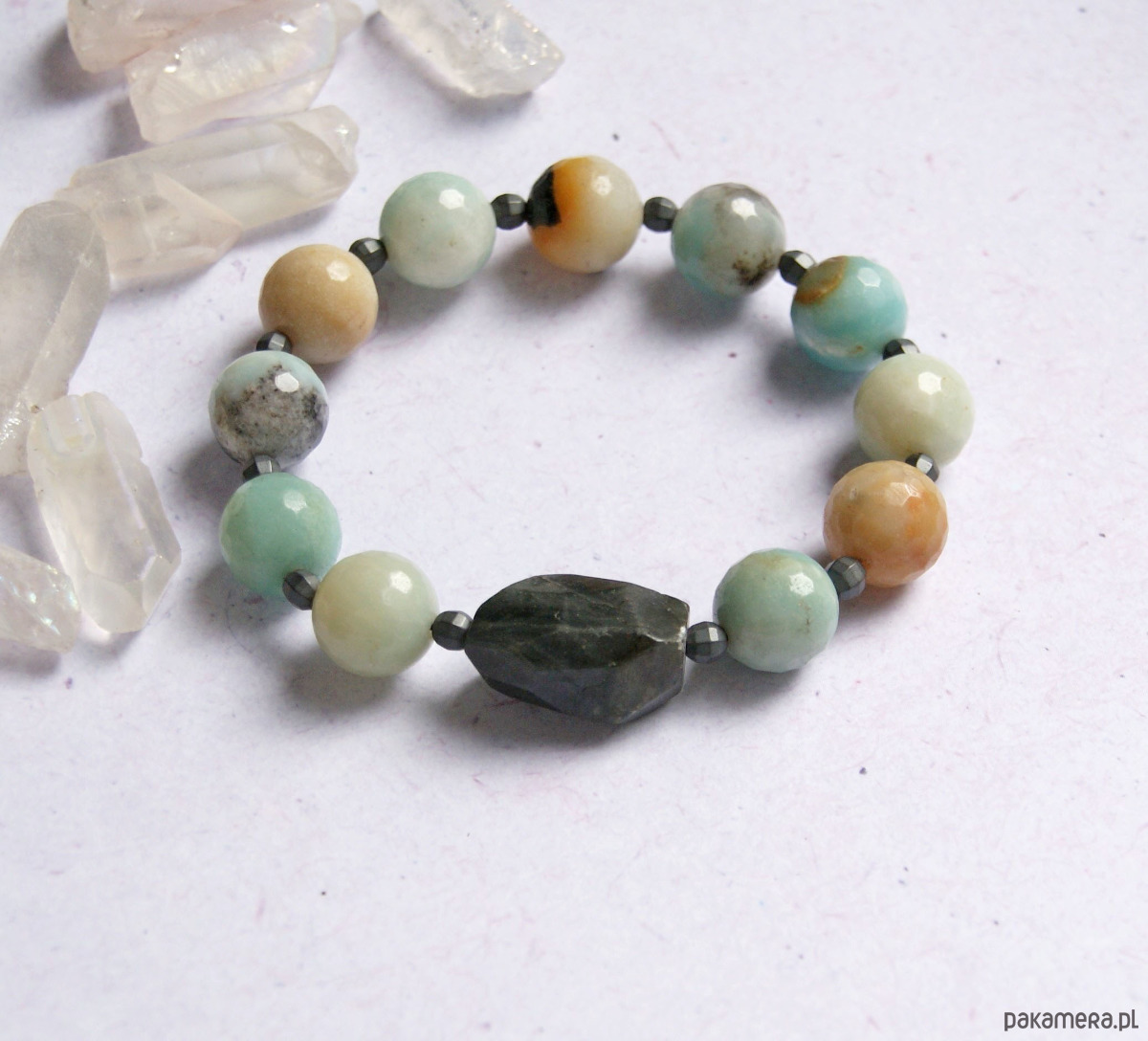 cudna bransoletka wykonana z dużych, fasetowanych kul wielobarwnego amazonitu (12mm), unikatowej, ciosanej bryłki labradorytu (ok.21mm).; przekładki to kuleczki matowego, fasetowanego hematytu (4mm).