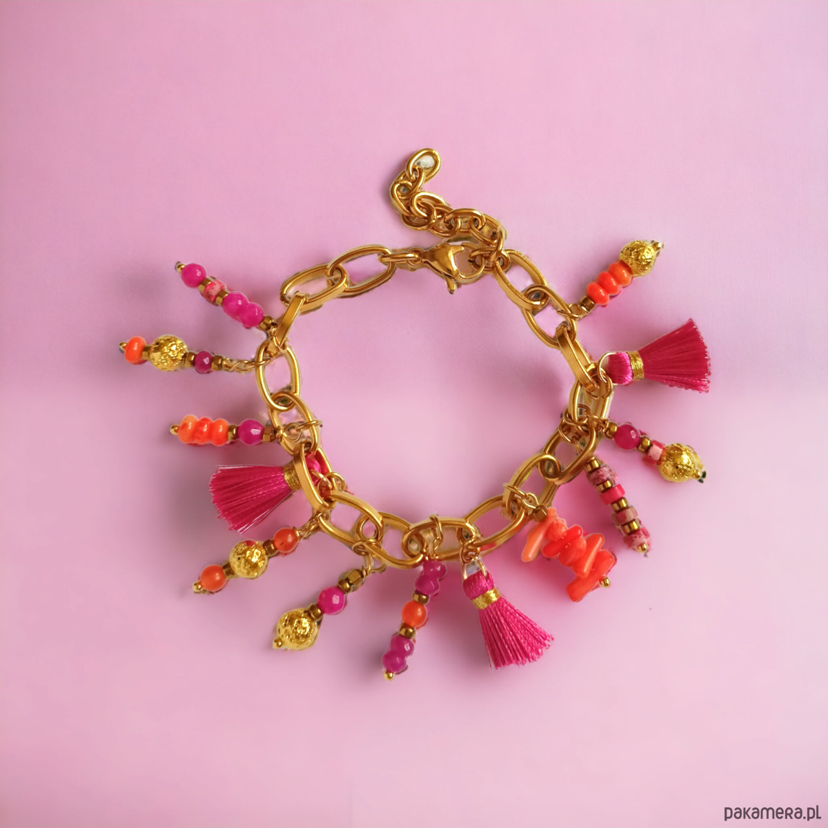 na łańcuchu umieściłam 13 charmsów wykonanych m.in. z : jadeitu, złotego hematytu, złotej lawy, korala, jaspisu i chwostów.
