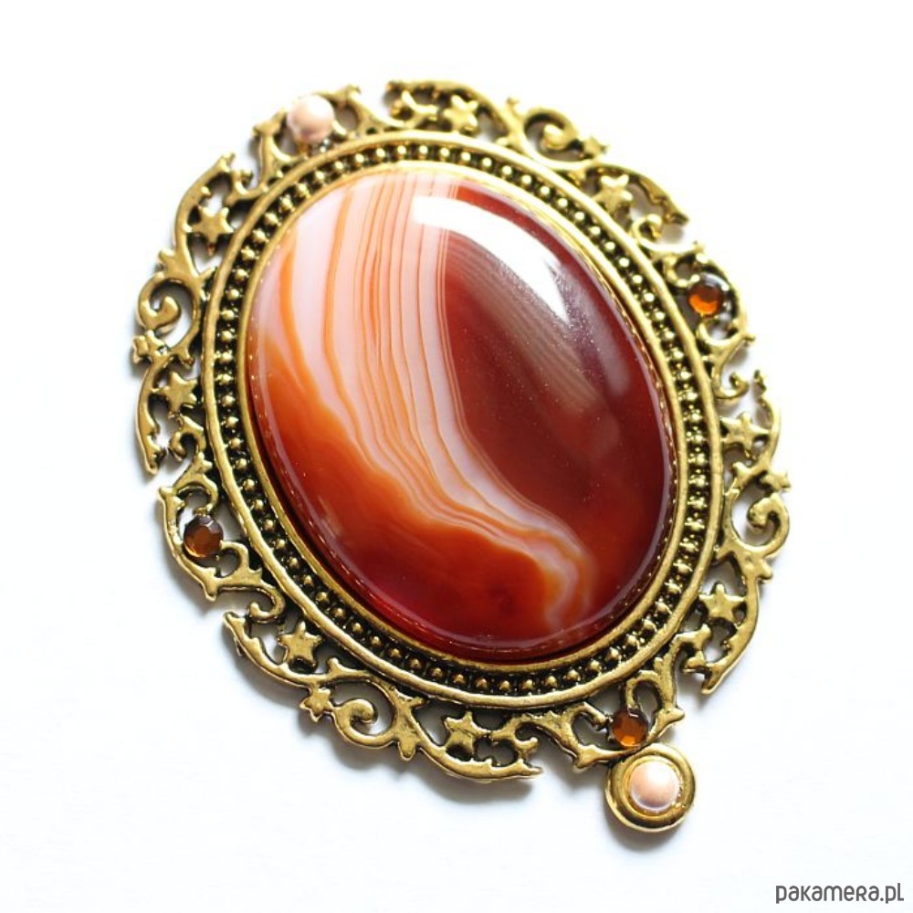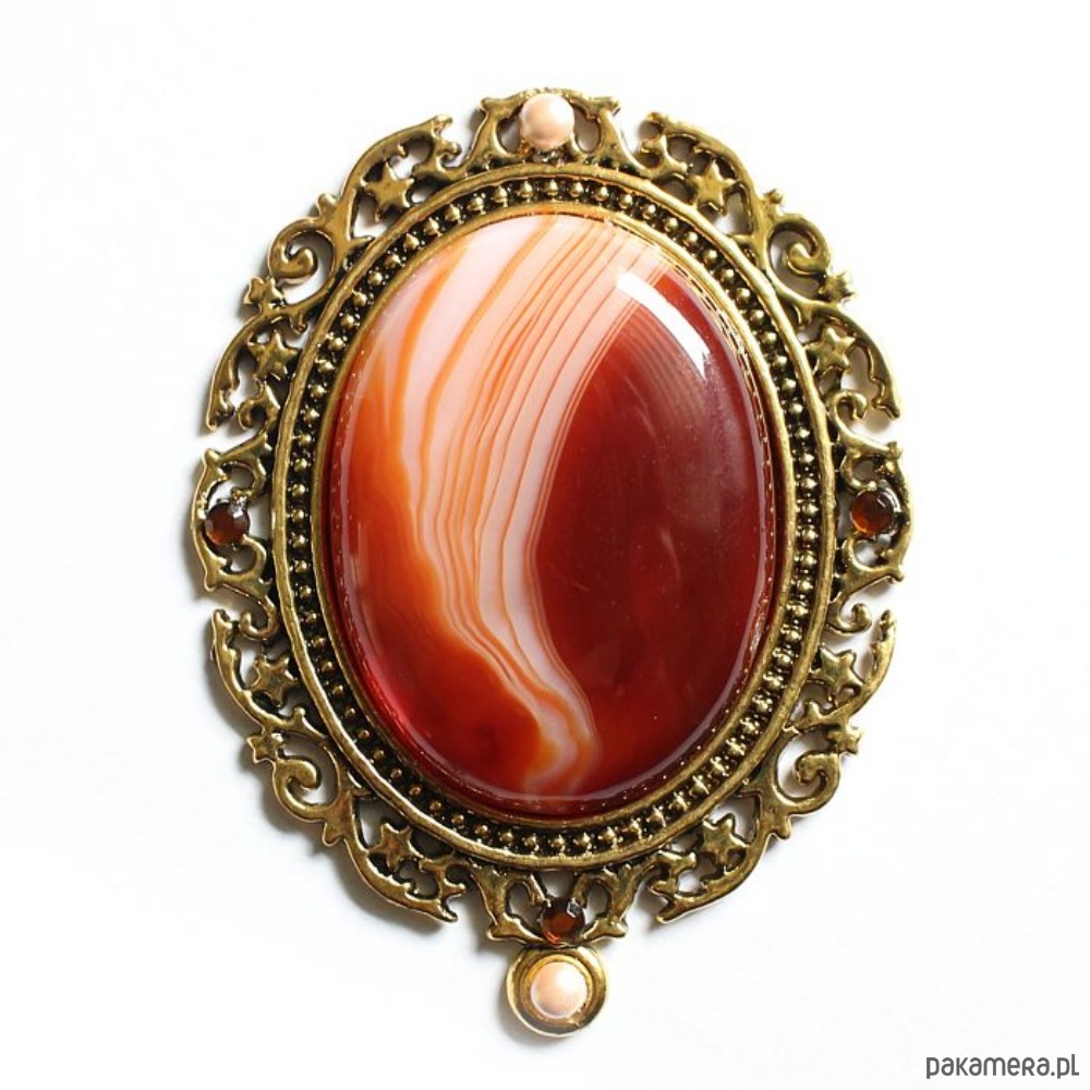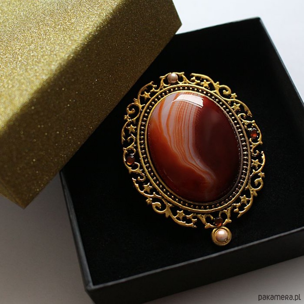 Autorska broszka na pozłacanej bazie ze szklanym kaboszonem, ozdobiona przepięknym kaboszonem Agatu czerwonego, oraz topazowymi cyrkoniami i perełkami.