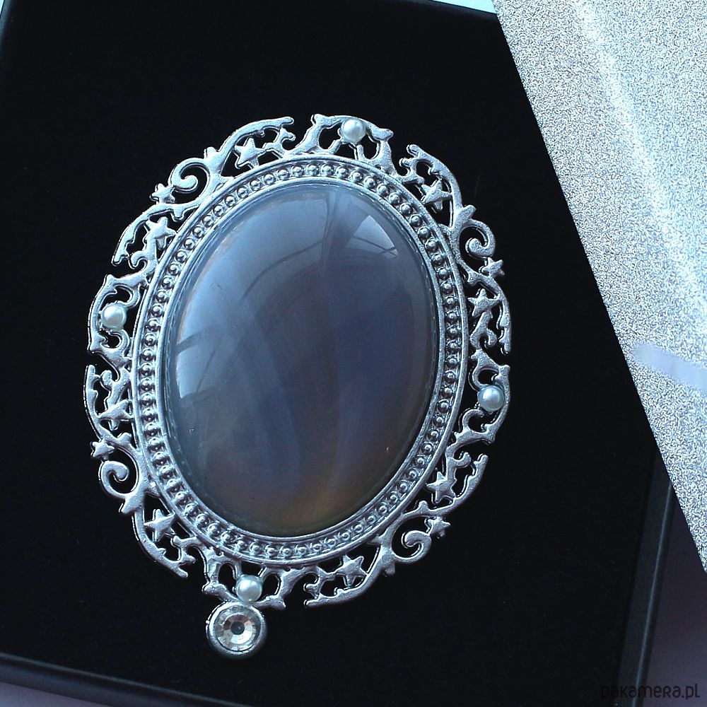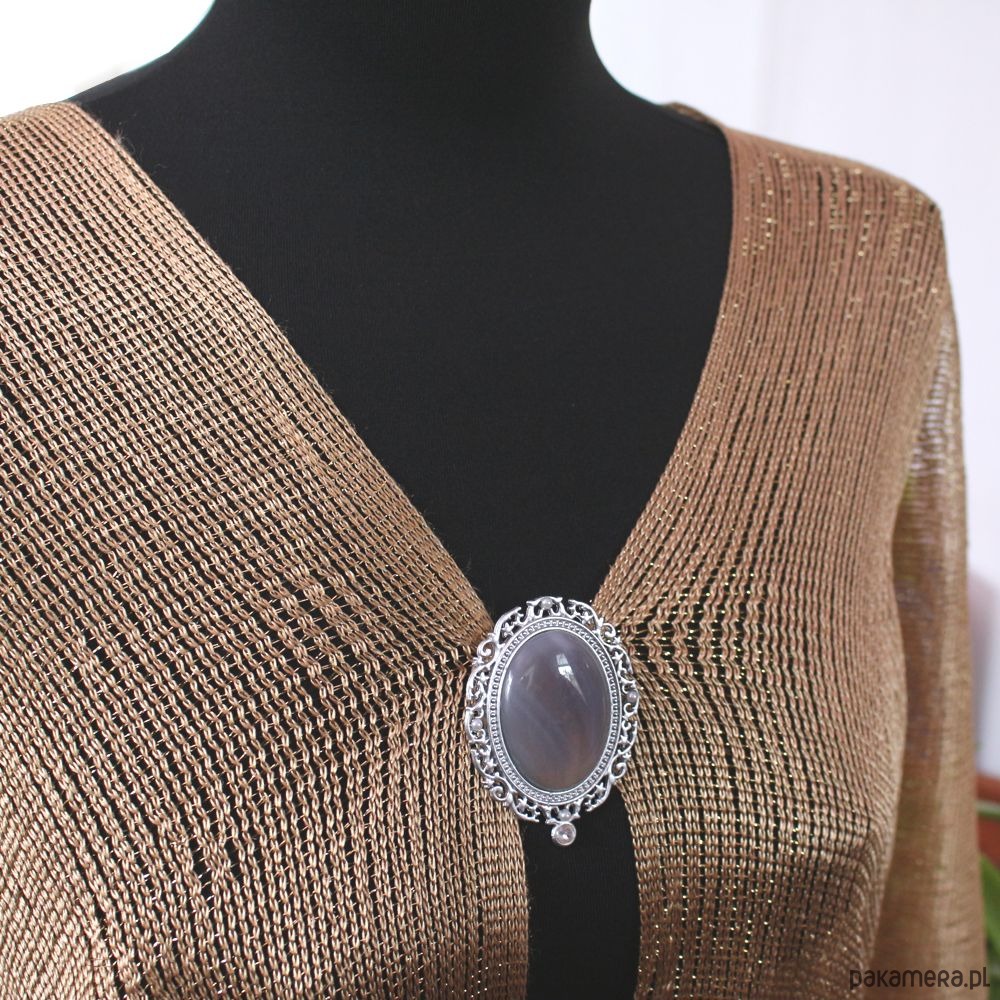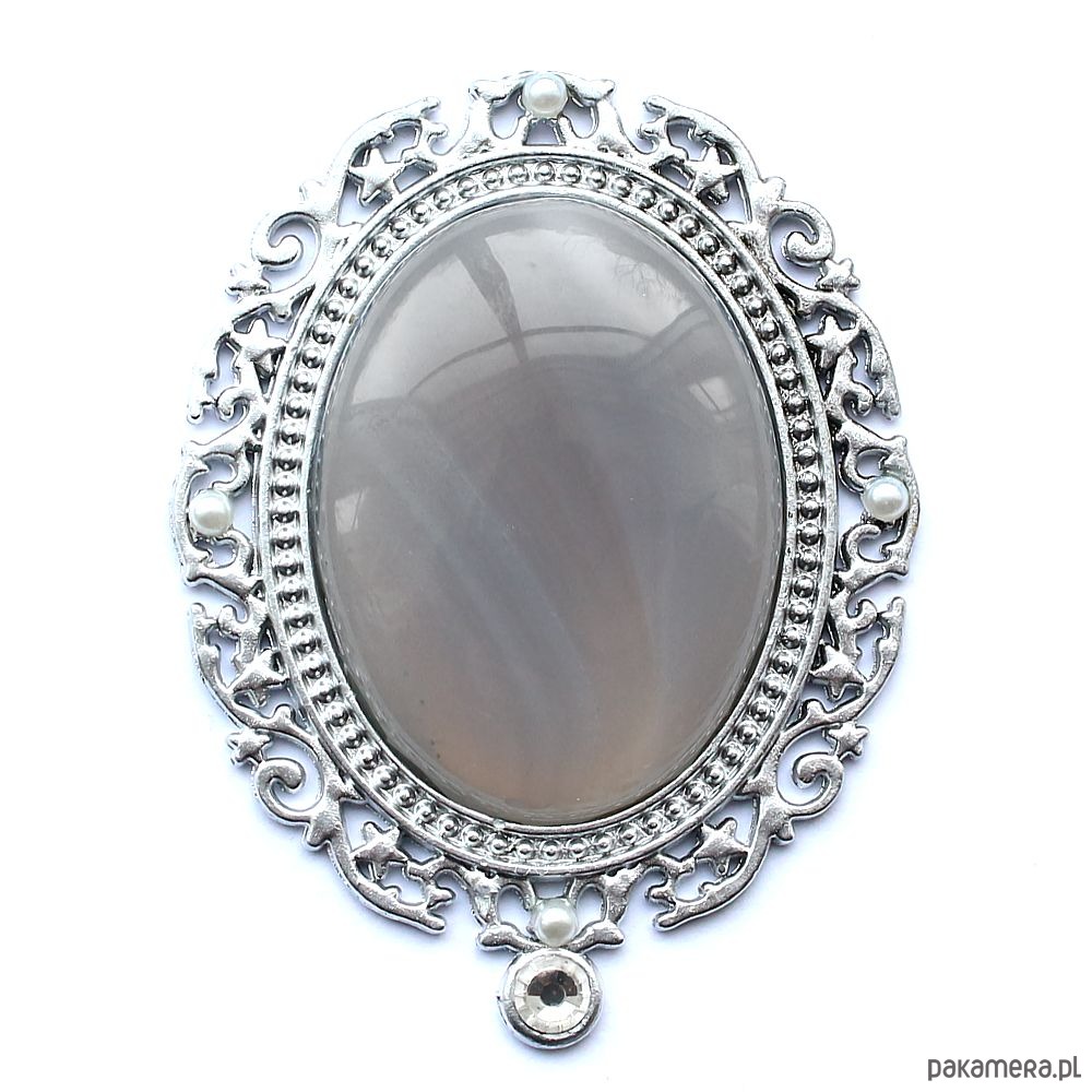 Autorska broszka w stylu neo retro na posrebrzanej ażurowej bazie, ozdobiona kaboszonem szarego agatu oraz perełkami i cyrkonią.