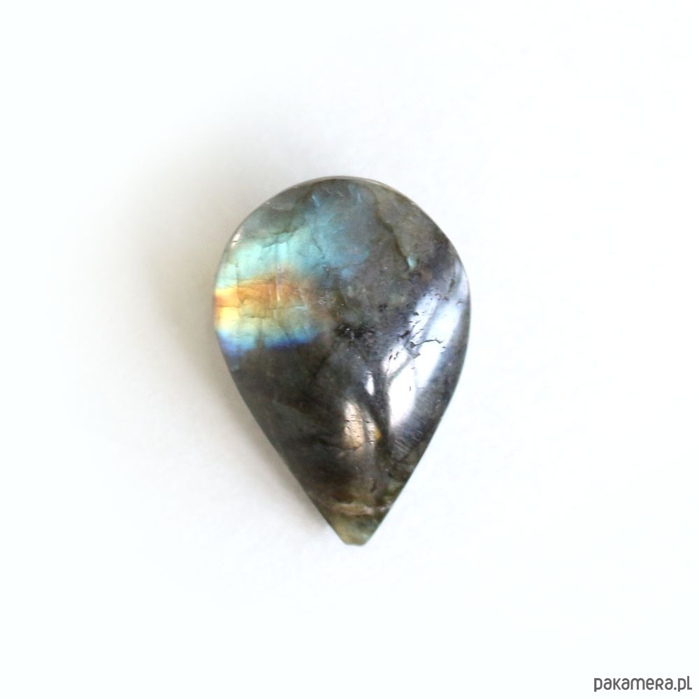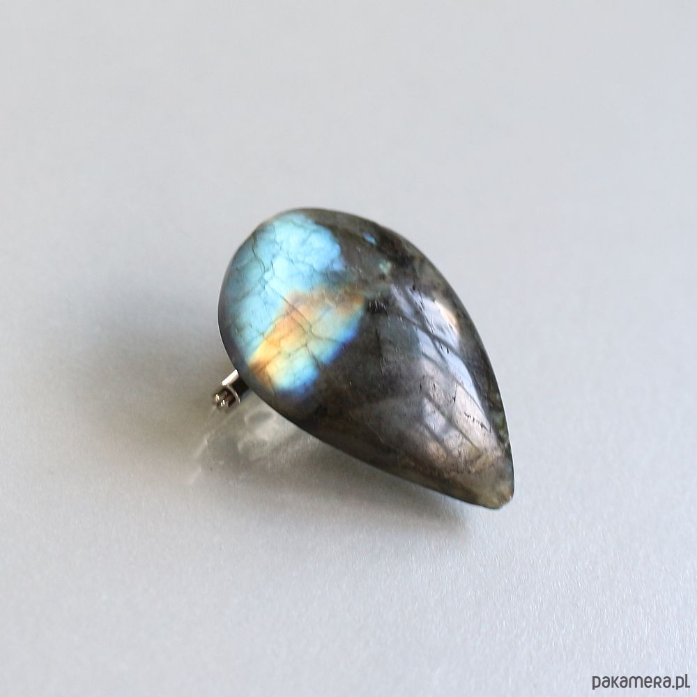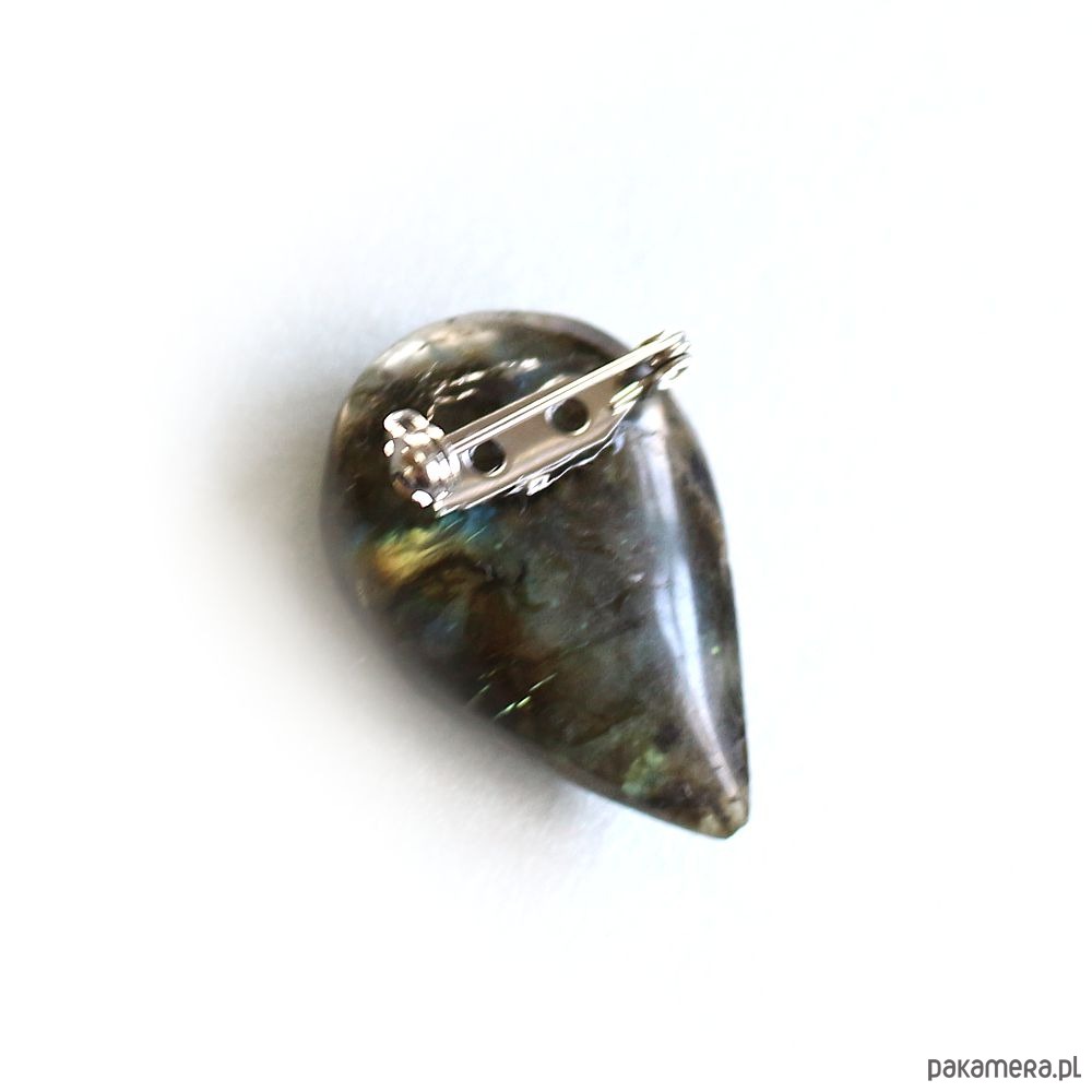 Ręcznie wykonana broszka kaboszonowa z labradorytem w kształcie łezki.