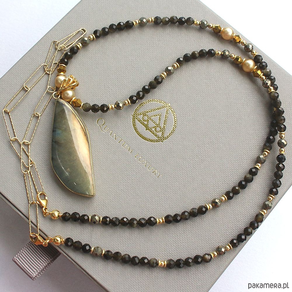 UNIKAT! Energetyczny, subtelny i elegancki ochronny naszyjnik mocy wykonany ręcznie z przepięknym okazem złotego labradorytu, z fasetowanym złotym obsydianem, pirytem, naturalną perłą w odcieniu szampańskim. Ozdobiony eleganckim młotkowanym łańcuszkiem przedłużającym z dwoma wygodnymi karabińczykami do regulacji długości oraz przekładkami ze srebra próby 925 pozłacanego 24k złota.