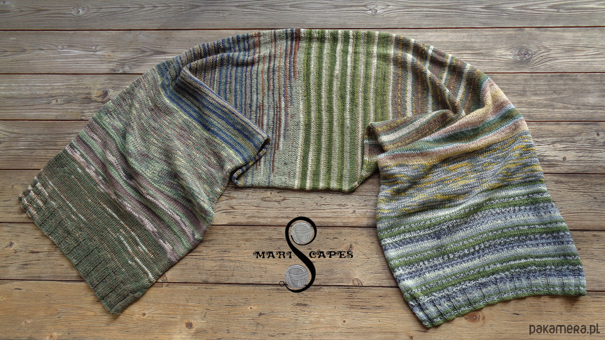 Długi i szeroki szal ręcznie dziergany na drutach z miękkiej cienkiej włóczki wełnianej (75% wełna, 25% poliamid) w pięknych odcieniach od brązu po oliwkowy/khaki, przeplatanego odrobiną granatu, szarości i innych kolorów.