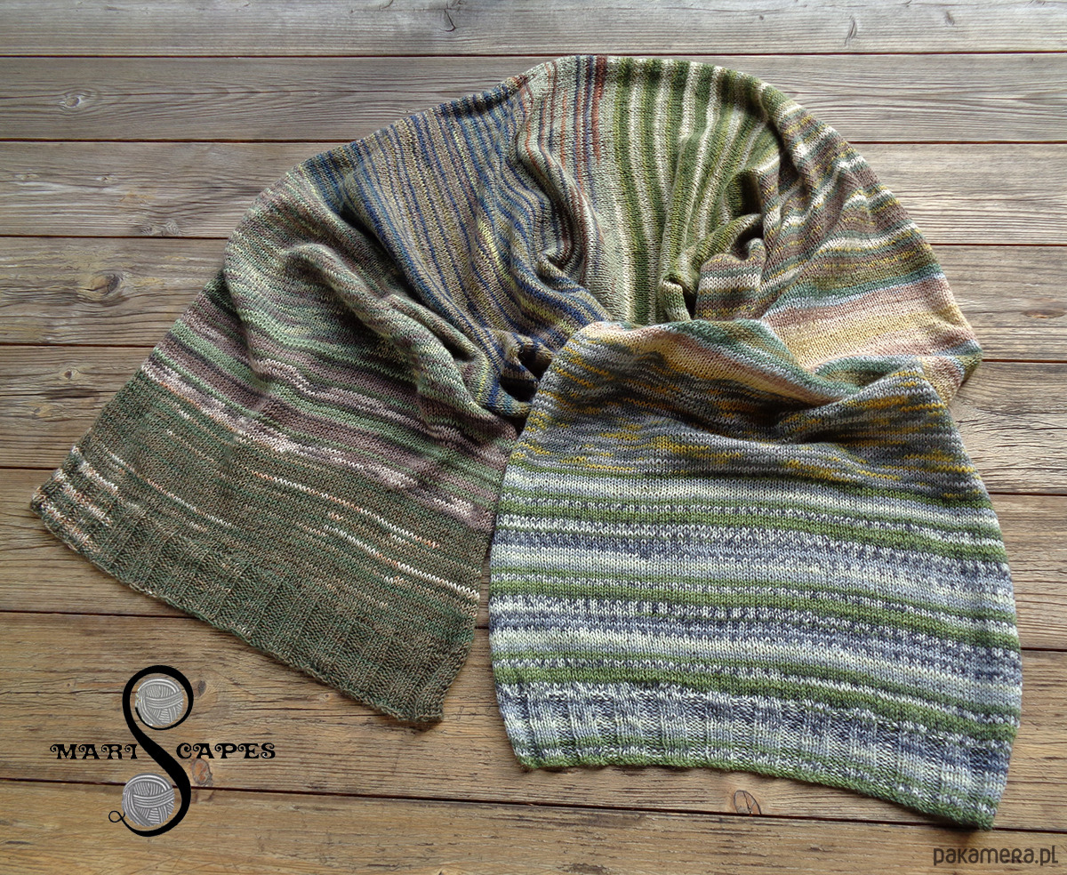 Szal został wyprany i zblokowany, lekkie rolowanie się brzegów jest naturalne dla dzianin dzierganych tym ściegiem.