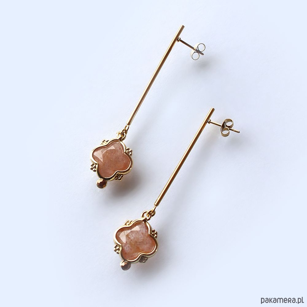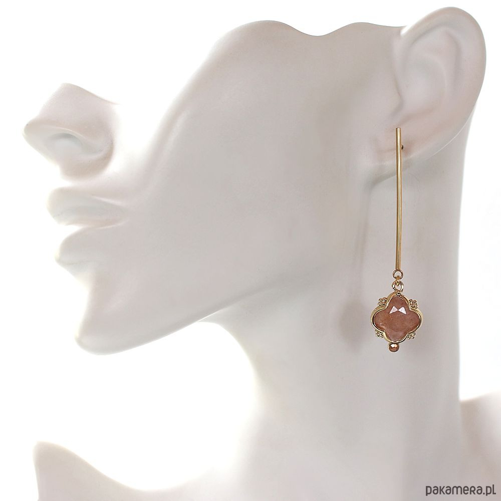 Eleganckie minimalistyczne kolczyki na biglu ze stali chirurgicznej pozłacanej 24k złotem, hypoalergiczne. Ozdobione pięknym, fasetowanym kwarcem truskawkowym w kształcie koniczyny. Kolczyki są bardzo lekkie!