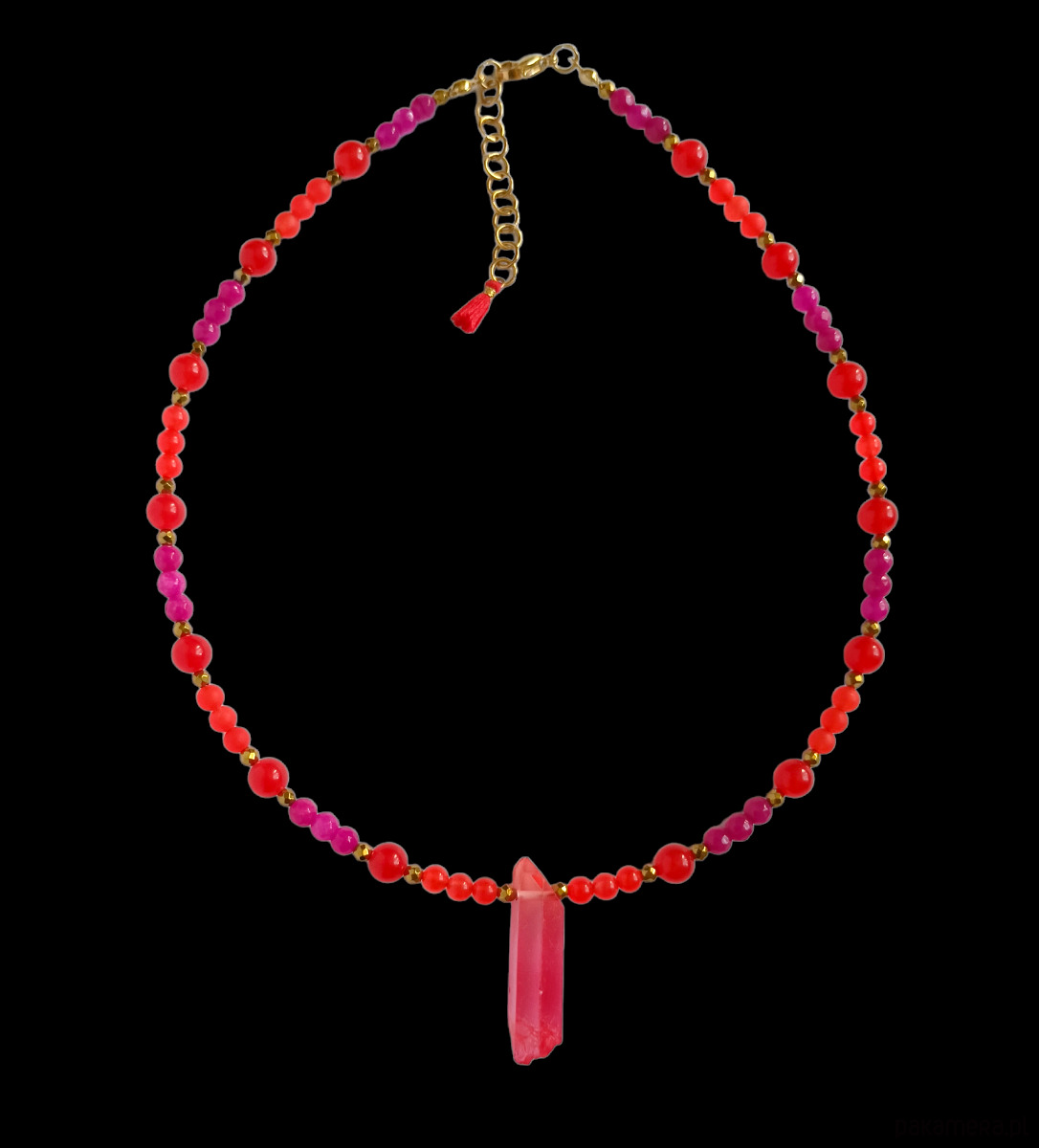 Wykonany z kolorowego jadeitu 4mm (kolor główny: matowy, jaskrawy pomarańcz + fuksja), jadeitu 6mm, nieregularnego, barwionego sopla kryształu górskiego (ok. 37mm) oraz przekładek ze złotego hematytu.
