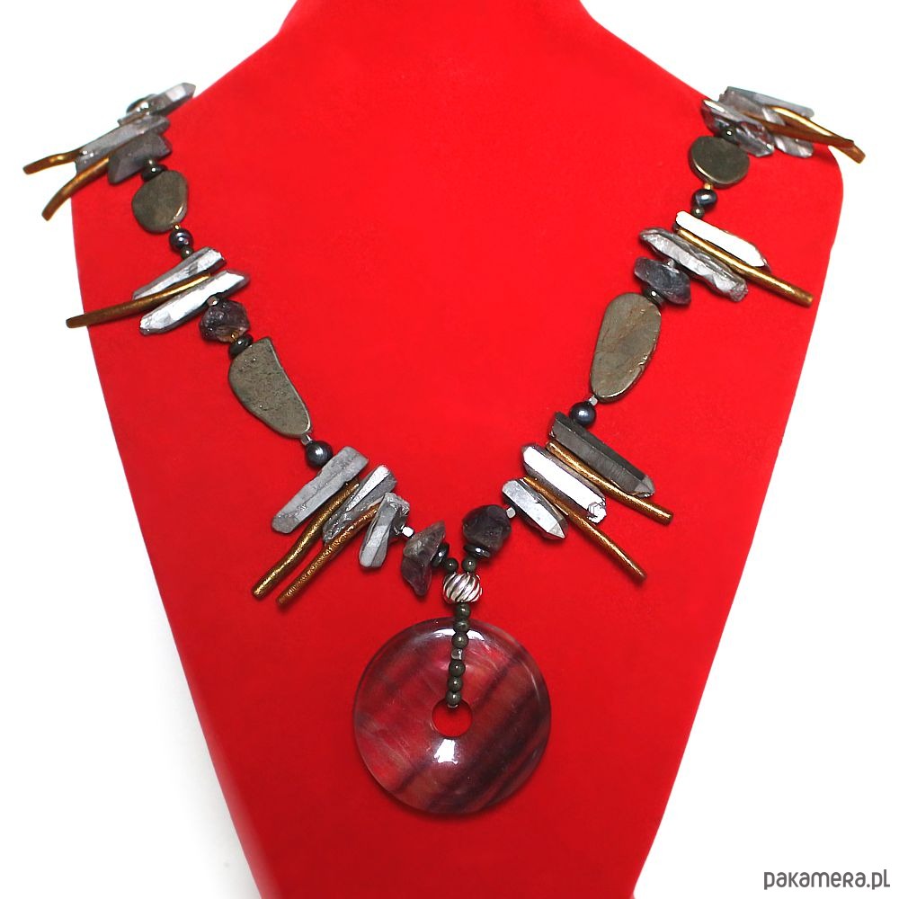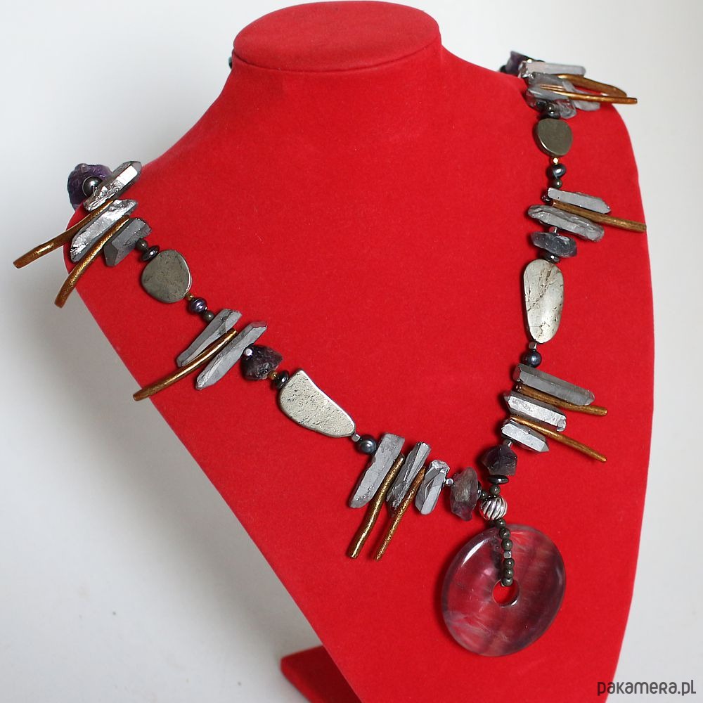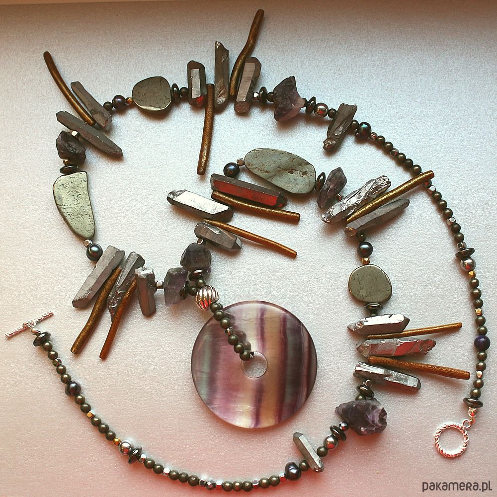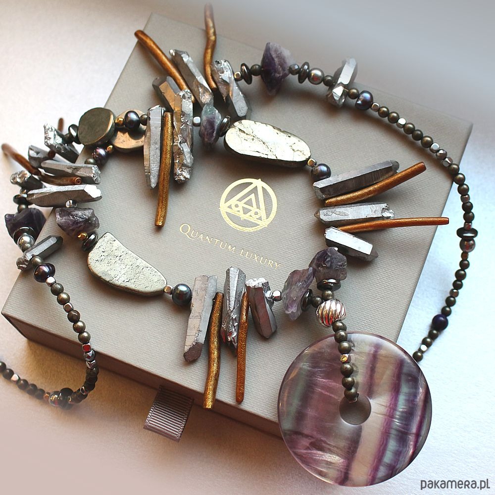 Autorski energetyczny naszyjnik wykonany ręcznie z fluorytu, kwarcu tytanowego, pirytu, ametystu, naturalnych pereł, teraherzu, hematytu, ozdobiony ręcznie zdobionym dużym, wygodnym zapięciem toggle i przekładkami ze srebra próby 925. Potężna kompilacja polecana szczególnie wizjonerom, liderom grupy i tym, którzy w naturalny sposób przewodzą innym. Zdrowe uziemienie naturalnych talentów Duszy, które równoważy i porządkuje rozproszoną energię.
