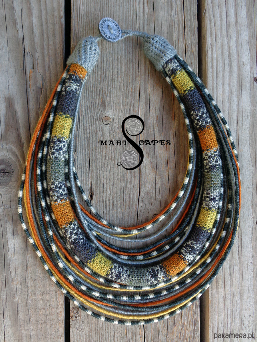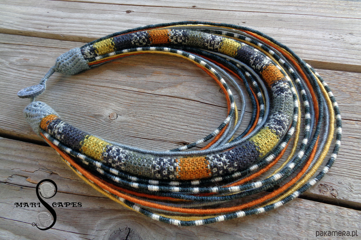 UNIKATOWY kaskadowy wielosznurkowy naszyjnik (tzw. masajka) własnoręcznie przeze mnie wyczarowany z mięciutkich włóczek akrylowych w pięknym, jesiennym połączeniu kolorów. Grubsza lina (75% wełna) jest pieczołowicie ręcznie dziergana na drutach i ręcznie zszywana, posiada unikatowy wzór niemożliwy do powtórzenia.