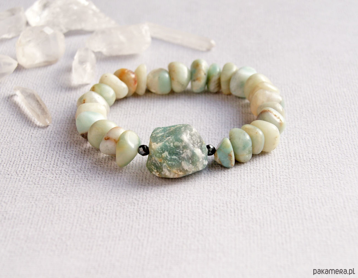 cudna bransoletka wykonana z AMAZONITU w 2 postaciach : nieregularnych plasterków (ok.12mm) oraz surowej bryłki (ok.23mm), umieszczonej pomiędzy dwoma kuleczkami hematytu.