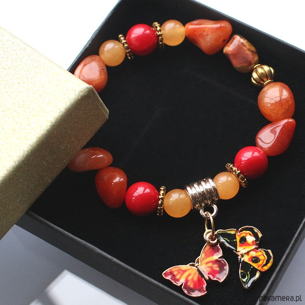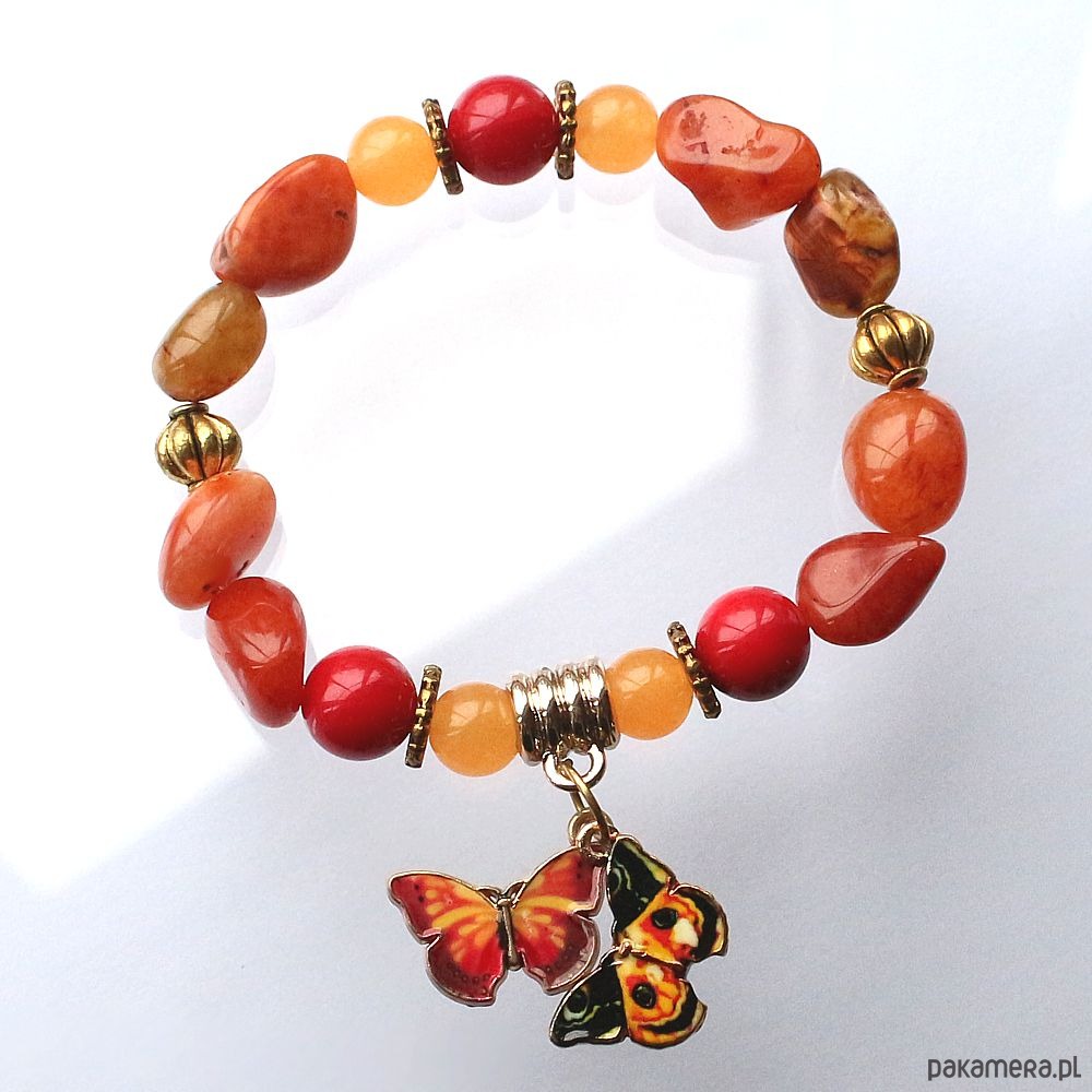 Unikatowa, elegancka bransoletka energetyczna z karneolem, agatem ognistym i koralem czerwonym. Soczysta, kobieca, ozdobiona pięknymi emaliowanymi zawieszkami z motylami.