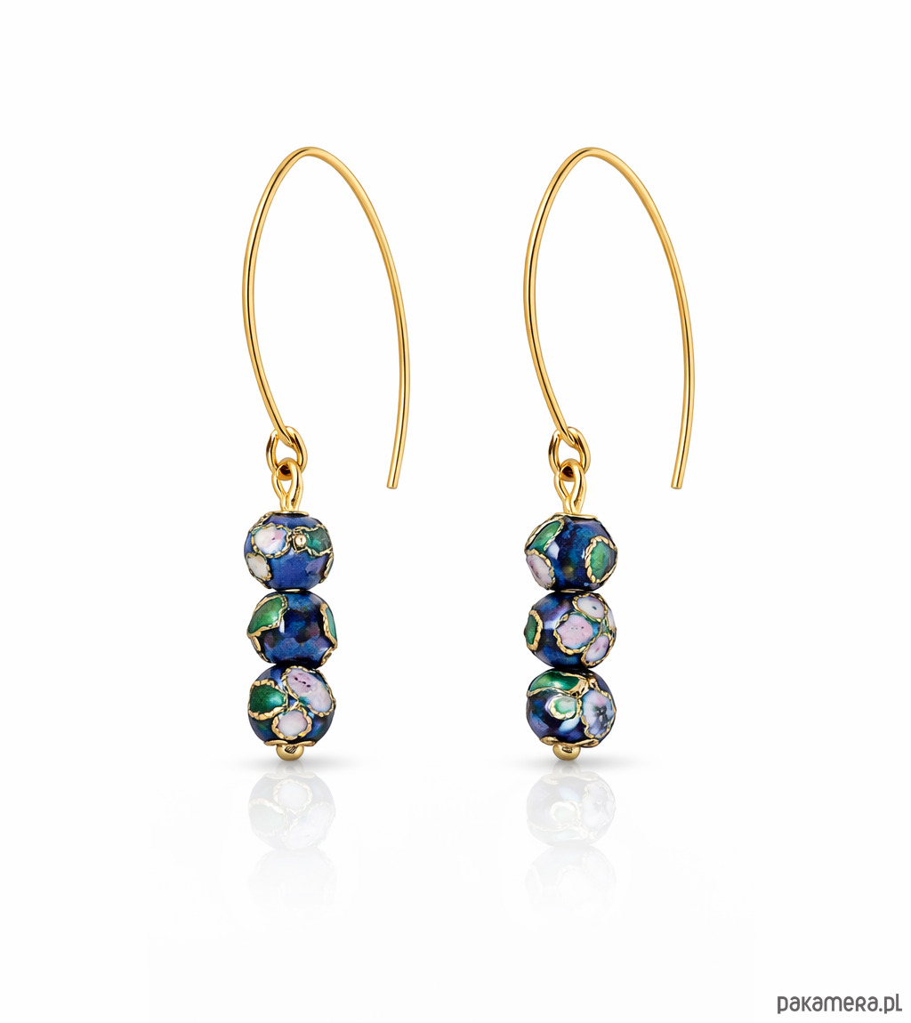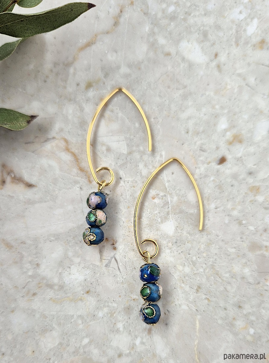 Kolczyki wykonane ręcznie, ze srebra pokrytego 24 karatowym złotem oraz niebieskich koralików cloisonne o średnicy 5mm.