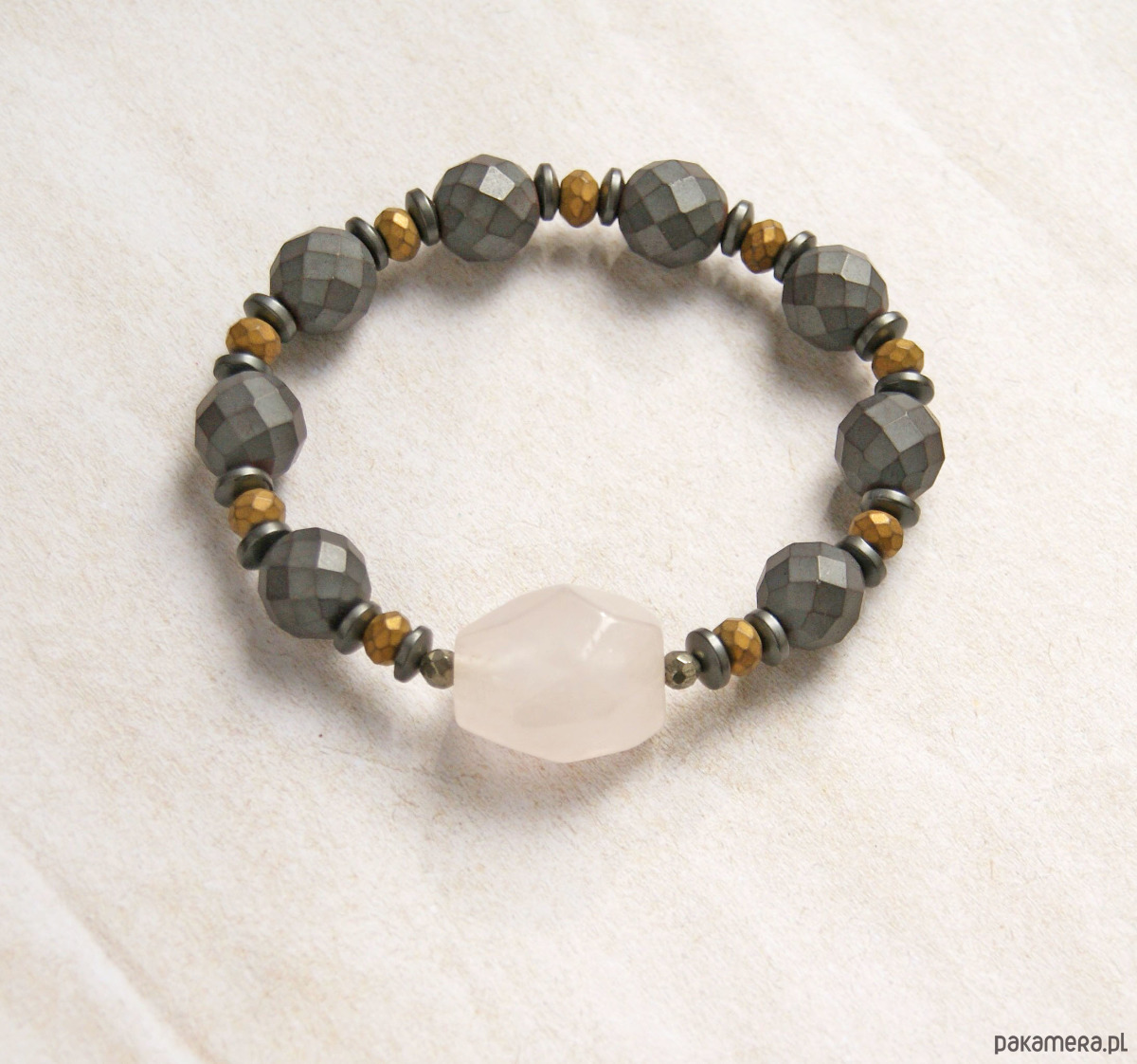 OKAZAŁA, niezwykle efektowna bransoletka na solidnej lince elastycznej, wykonana z ogromnej bryłki kwarcu różowego (ok.20mm). matowego, fasetowanego hematytu (12mm), oponek fasetowanego hematytu.