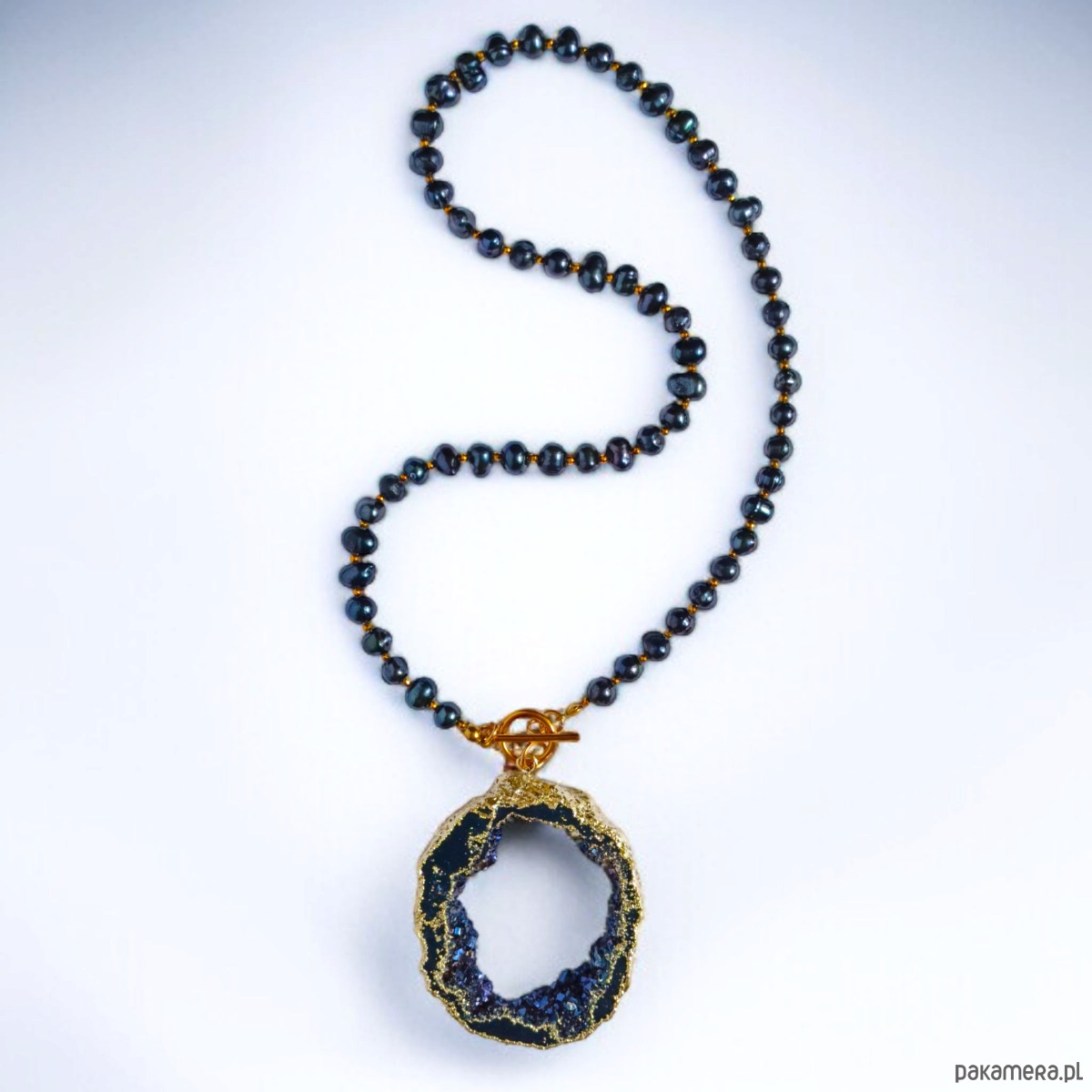 Wykonany z nieregularnych, granatowych pereł słodkowodnych - wszystkie oddzielone od siebie drobniutkimi kuleczkami fasetowanego, złotego hematytu (ok. 2mm).