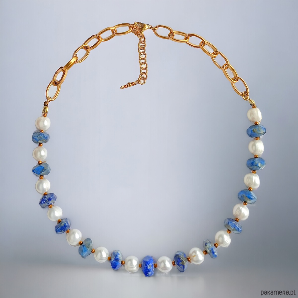 wykonany z nieregularnych, ciosanych poduszek LAPIS LAZULI (ok.9mm) oraz dużych, naturalnych pereł słodkowodnych (ok.10mm) i złotego hematytu.
