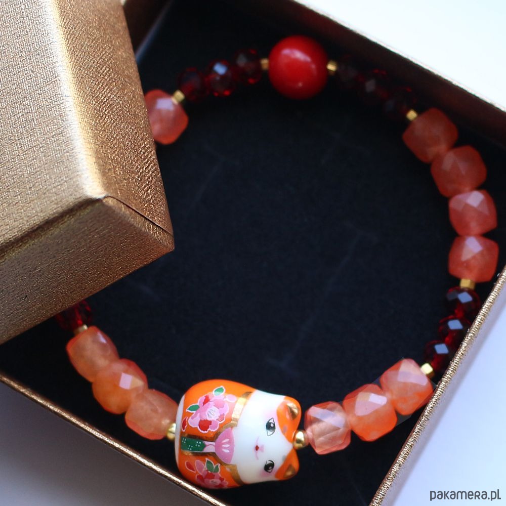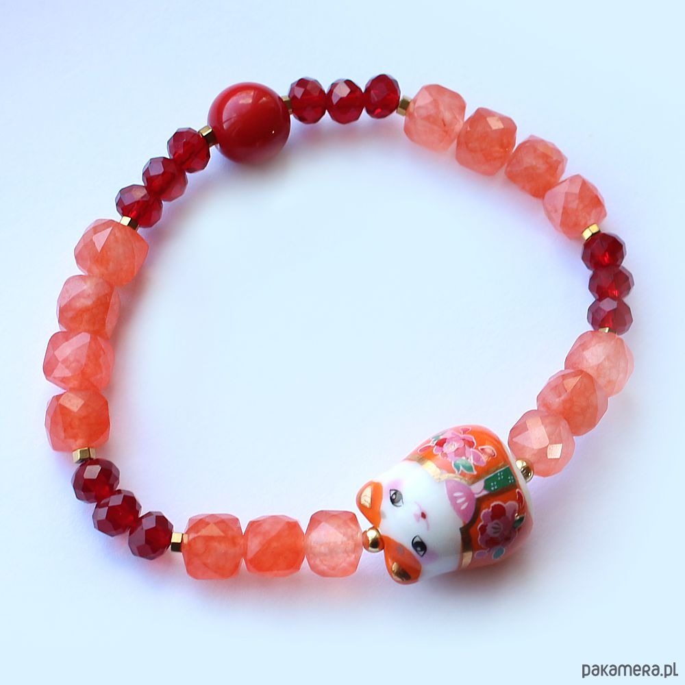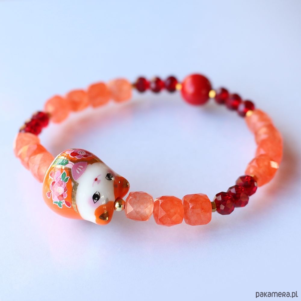 Energetyczna bransoletka na szczęście z oryginalnym ręcznie malowanym lucky cat - Maneki Neko, z fasetowanym jadeitem w niesamowitym, pomarańczowo-arbuzowym odcieniu oraz koralem, rubinem czerwonym i hematytem pozłacanym 14k złotem. Przekładki kule ze srebra próby 925 pozłacanego 24k złotem.