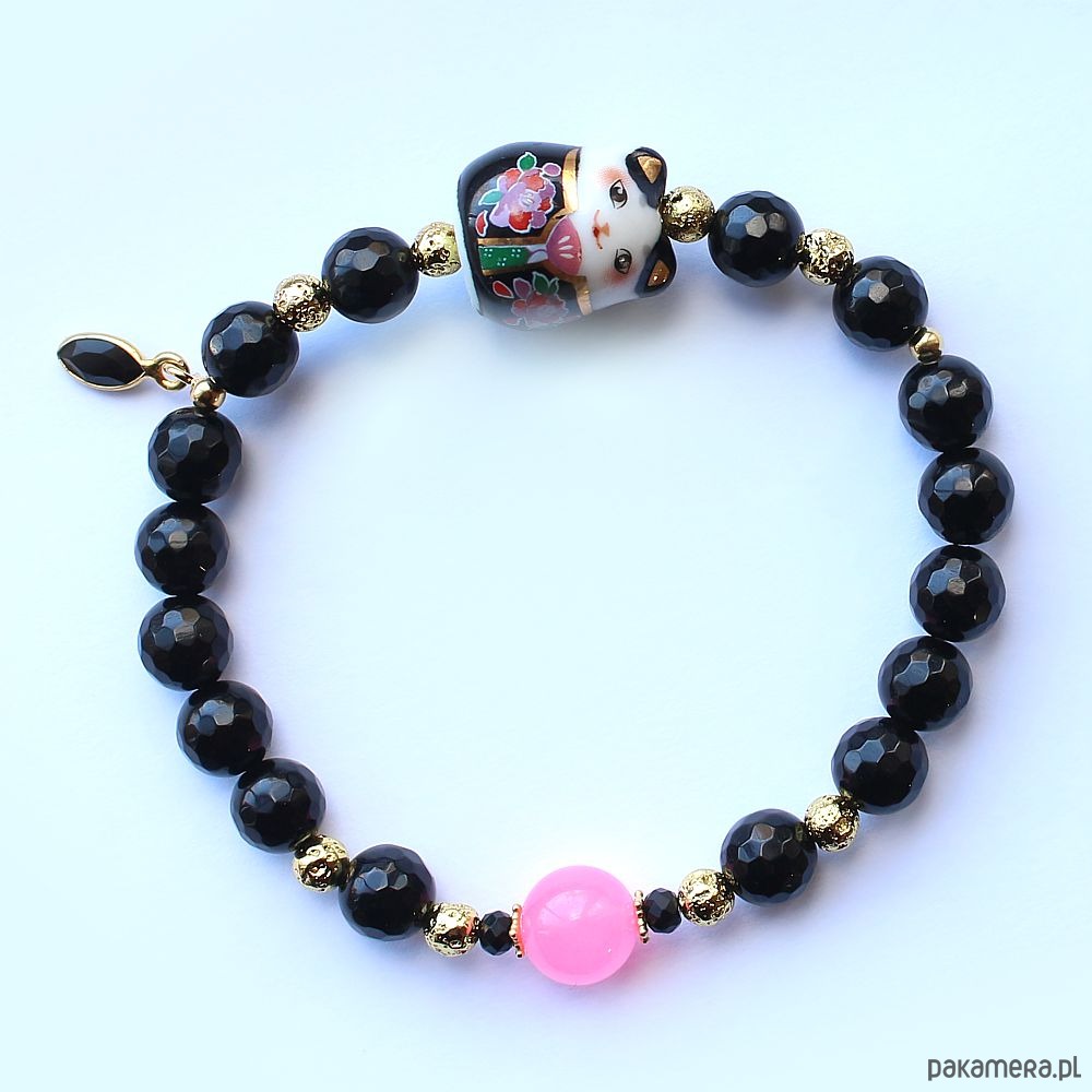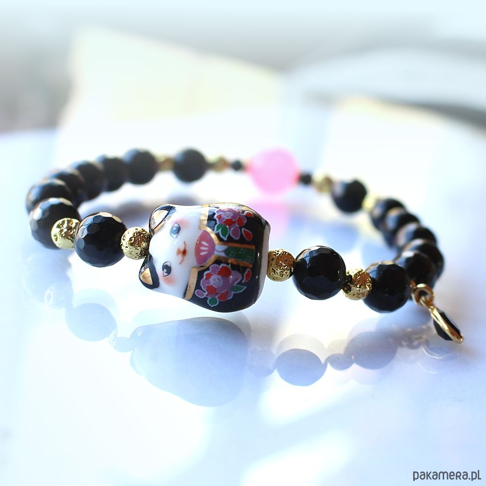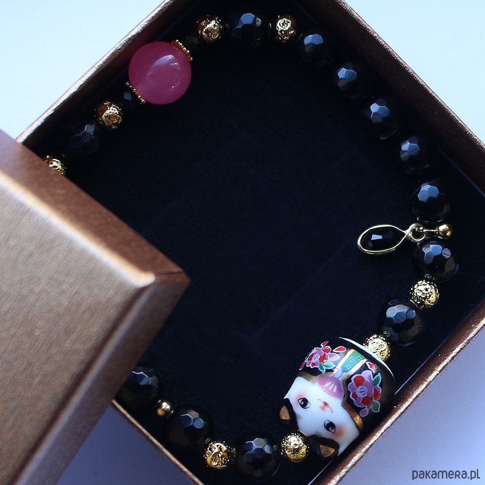 Antystresowa bransoletka ochronna na szczęście z oryginalnym ręcznie malowanym lucky cat - Maneki Neko, z fasetowanym onyksem, spinelem, pozłacaną lawą wulkaniczną, chalcedonem i hematytem pozłacanym 14k złotem. Ozdobiona zawieszką z fasetowanym onyksem oraz przekładkami ze srebra próby 925 pozłacanymi 24k złotem.