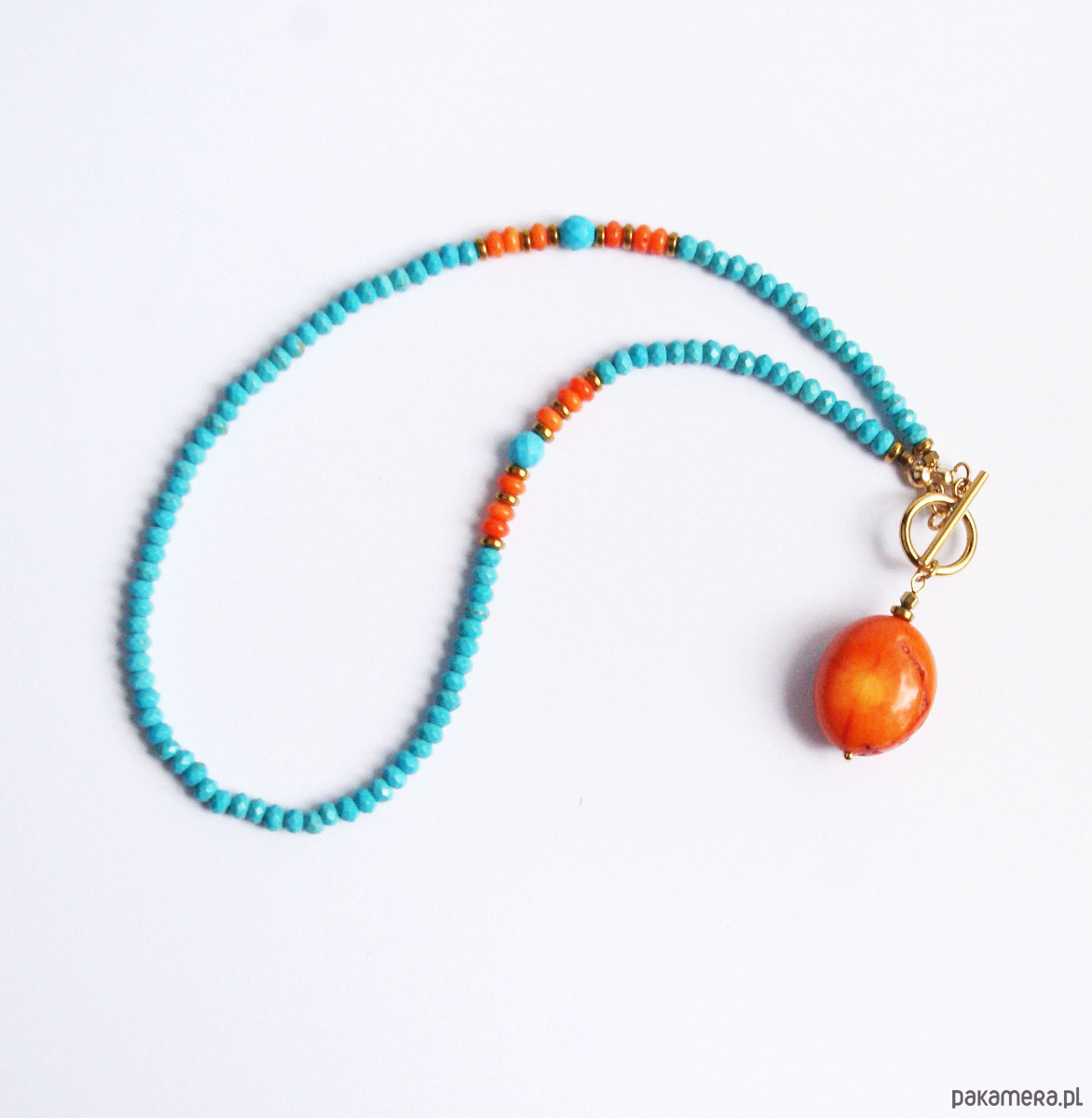 Krótki, efektowny naszyjnik wykonany z fasetowanych oponek magnezytu (ok. 4,5mm) i kulek ok. 6,5mm, perły słodkowodnej, korala pomarańczowego w formie oponek i zawieszki, złotego hematytu (przekładki) .