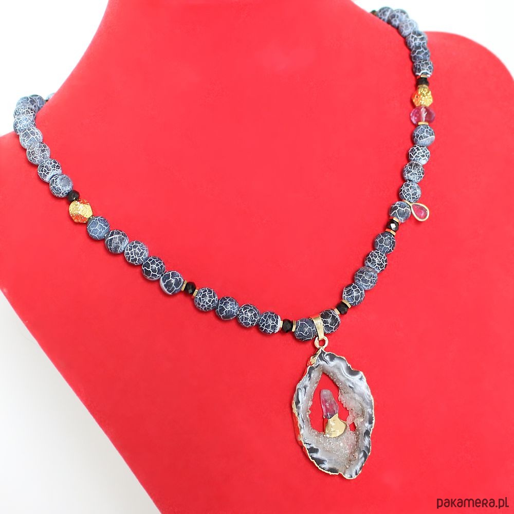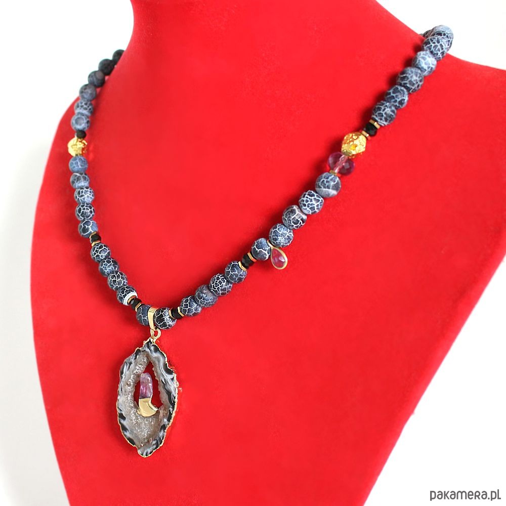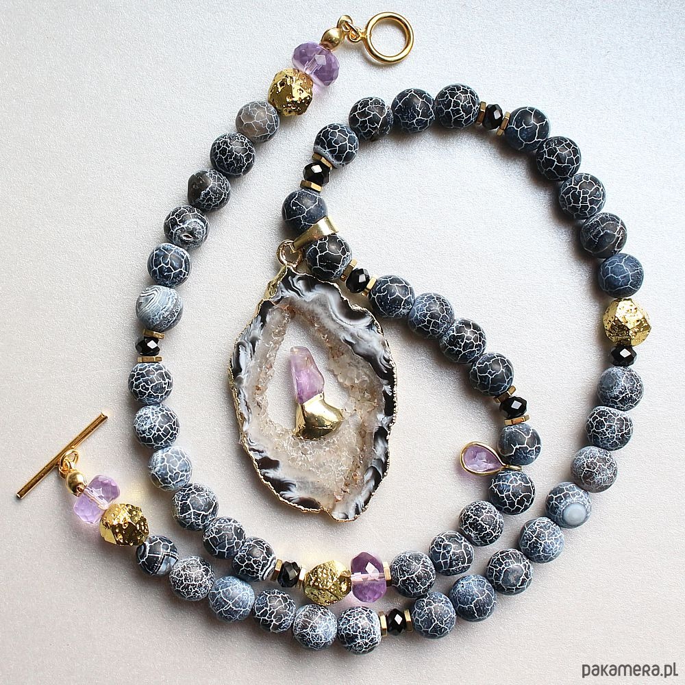 UNIKAT - Naszyjnik z druzą agatu, ametystem, spinelem i lawą