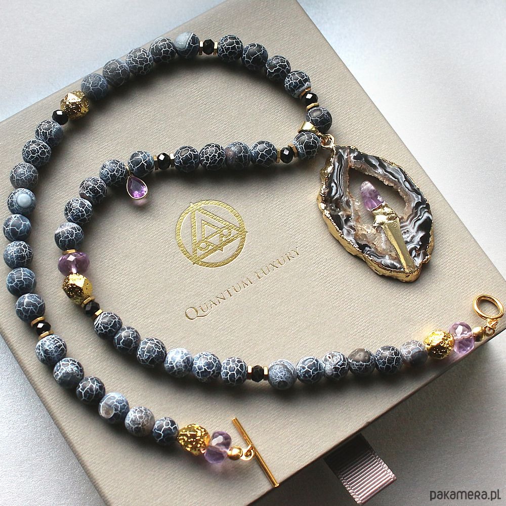 Autorski energetyczny naszyjnik asymetryczny z trawionych agatów, z przepiękną druzą agatu z wkomponowanym ametystem, w oprawie pozłacanej 24k złotem. Ozdobiony spinelami, lawą wulkaniczną i hematytami pozłacanymi 24k złotem, fasetowanymi ametrynami oraz zawieszką z ametystem fasetowanym.