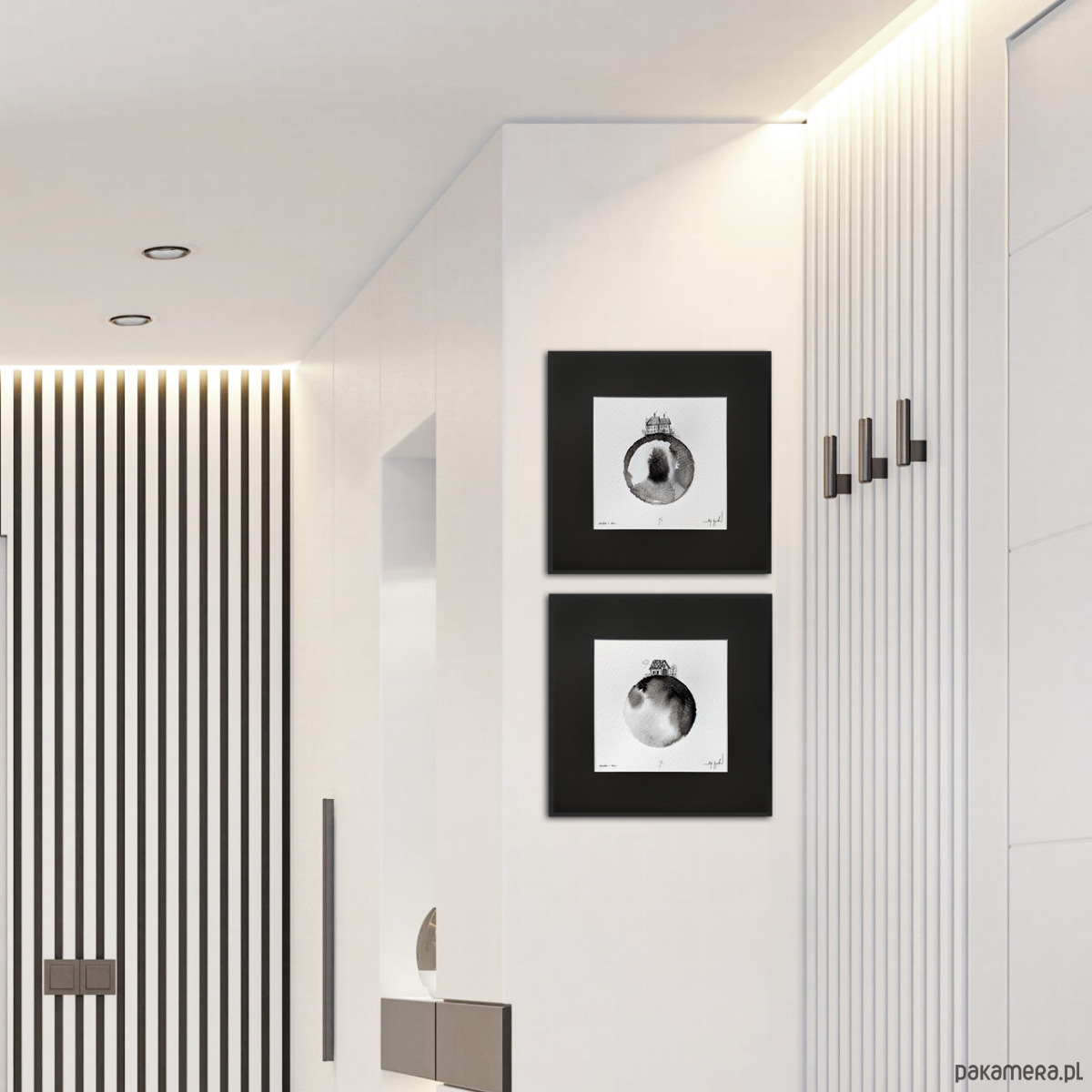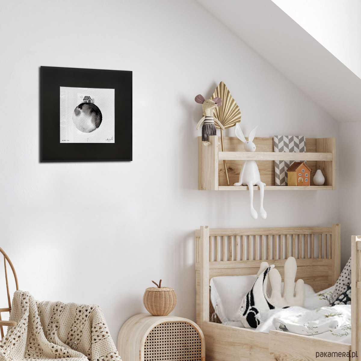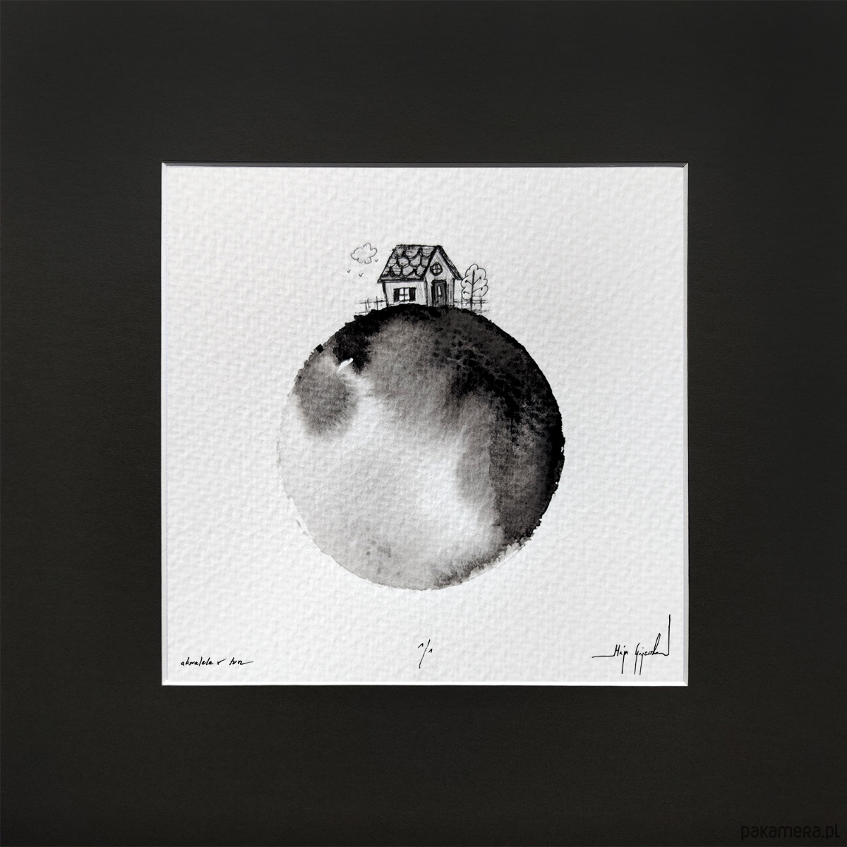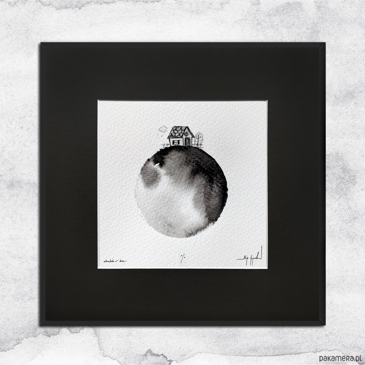 Praca oprawiona jest w antracytowe passe partout i czarną, aluminiową ramę. Gotowa do powieszenia na ścianie.