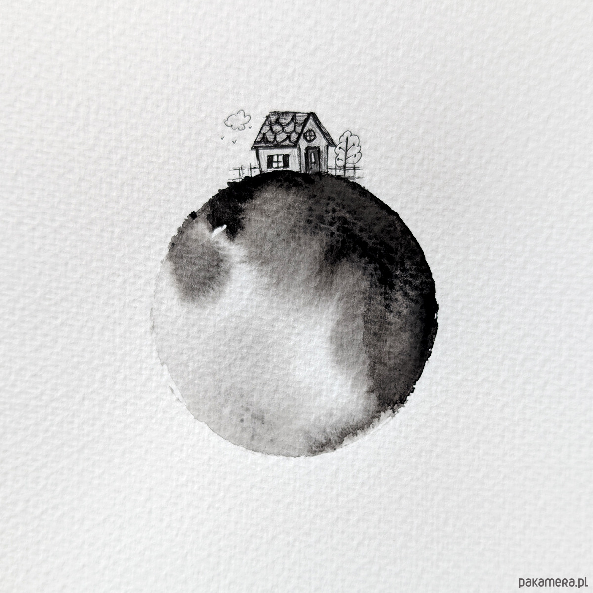 Ręcznie malowana akwarela z tuszem na białym, lekko fakturowanym papierze. Pojedyncza sztuka.