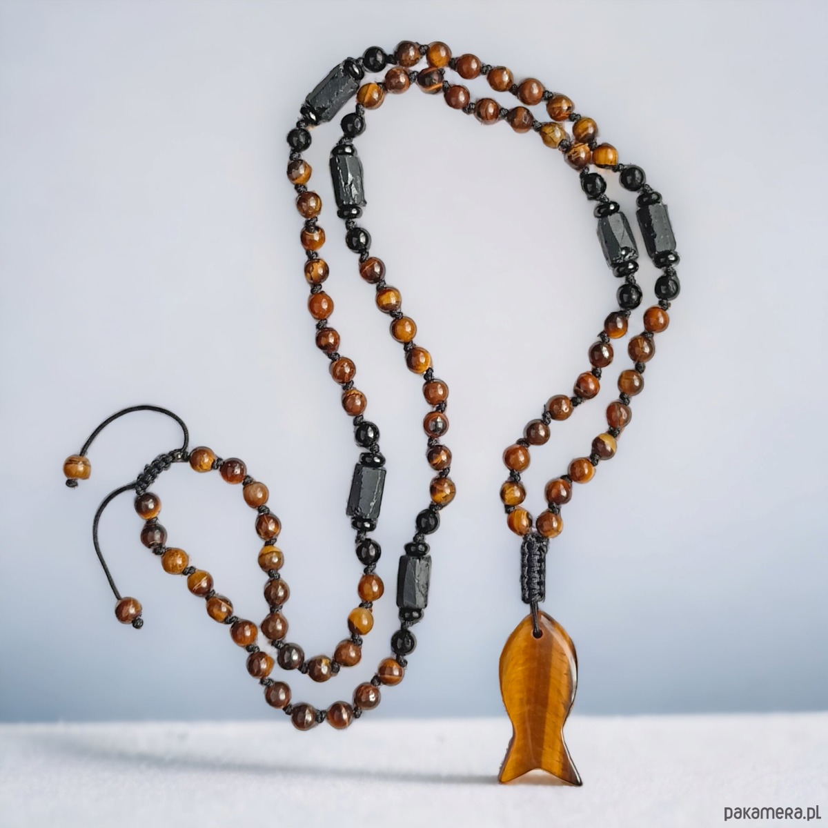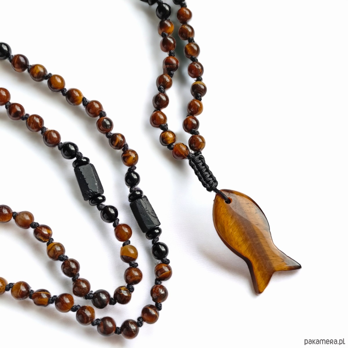 UNIKAT : rybka : naszyjnik męski : TYGRYSIE OKO, turmalin, ONYKS