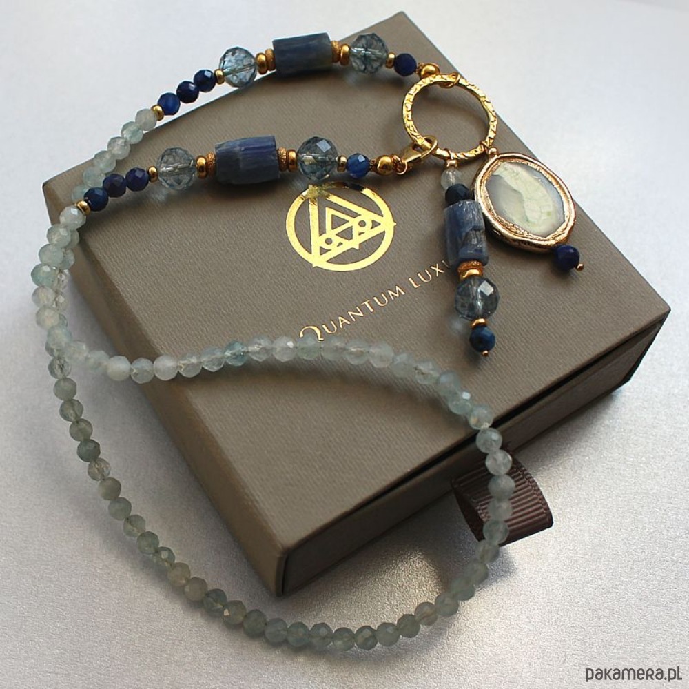 Energetyczny choker, subtelny i elegancki naszyjnik mocy wykonany ręcznie z surowego i fasetowanego kyanitu, akwamarynu. Ozdobiony modnym elementem w centrum naszyjnika z efektownego gniecionego okręgu oraz przekładkami ze srebra próby 925 pozłacanego 24k złotem.