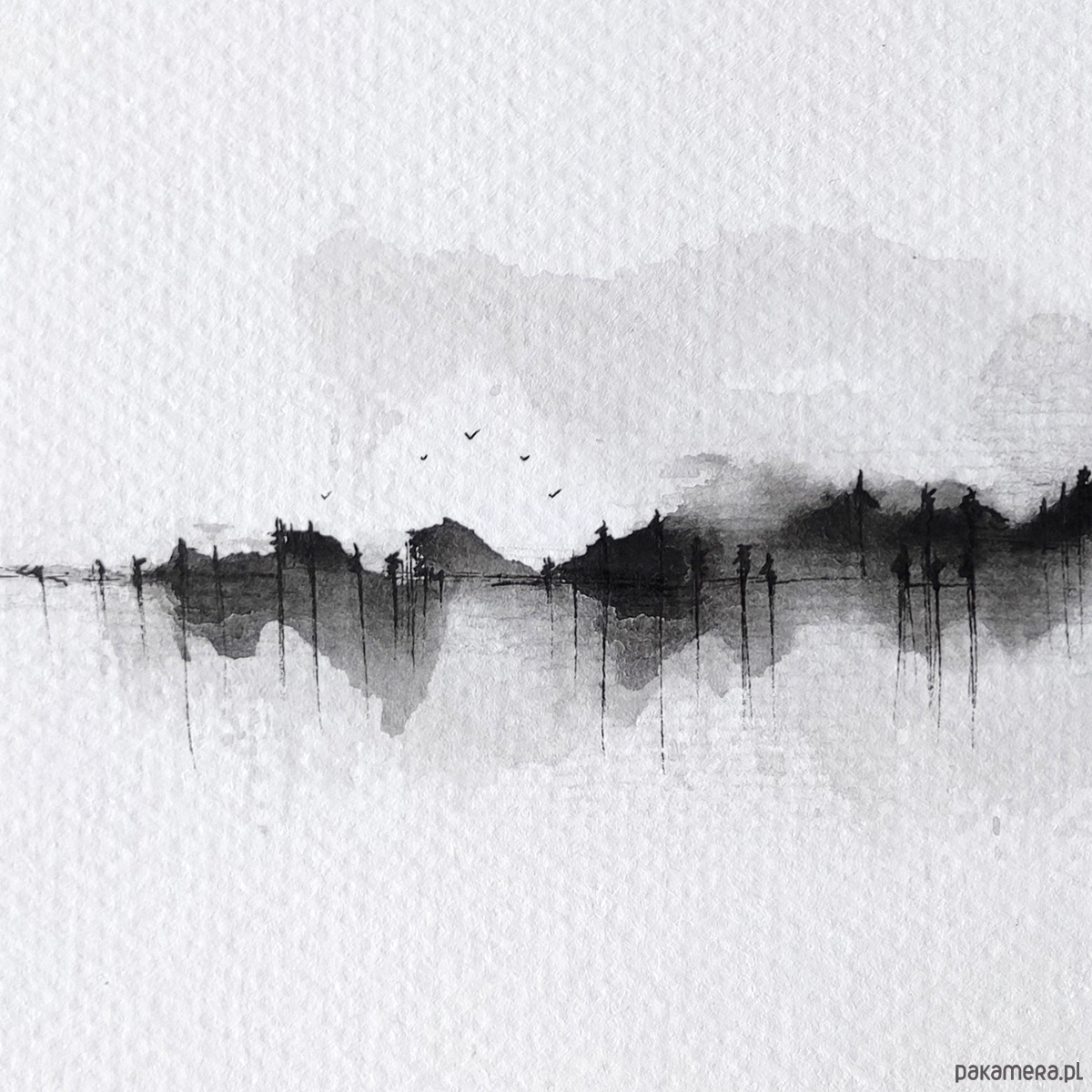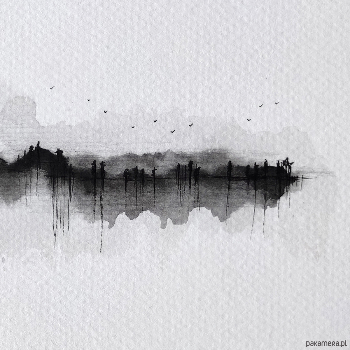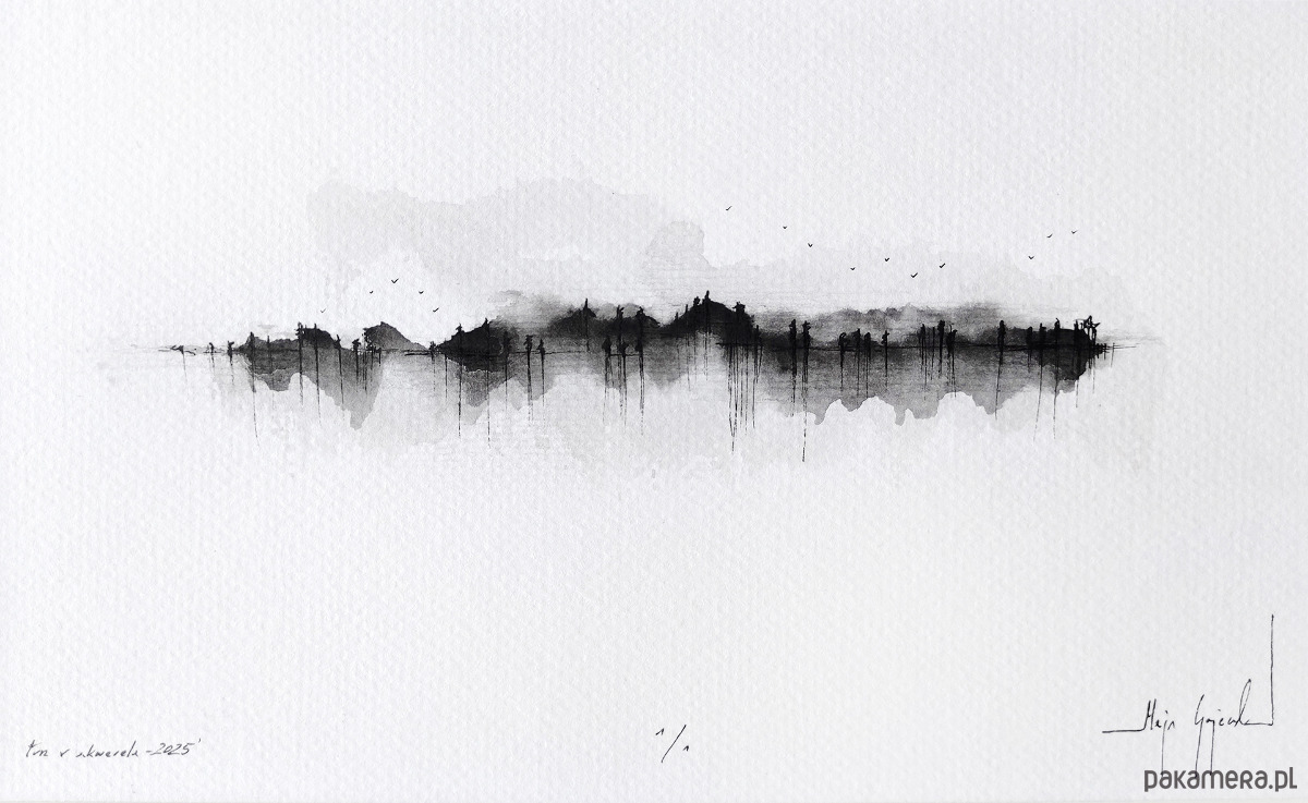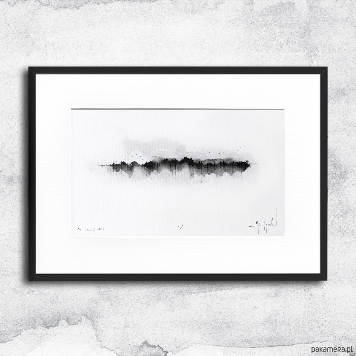 Każda z prac wykonana jest w pojedynczym egzemplarzu. Autorski rysunek wykonany w technice tusz i akwarela na białym, lekko fakturowanym, tradycyjnym papierze graficznym. Praca oprawiona jest w białe passe partout i czarną, aluminiową ramę.