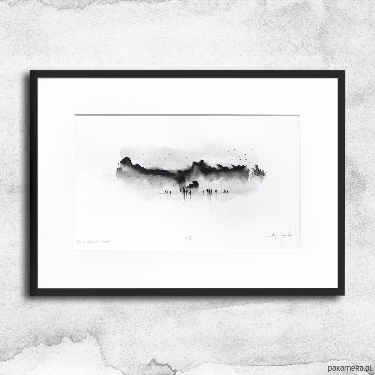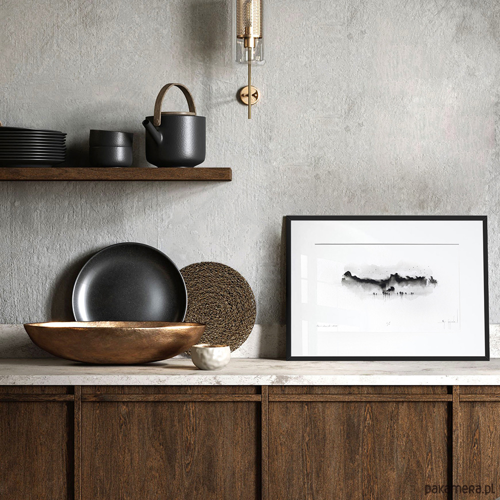 - rysunek oprawiony w białe passe partout i czarną, aluminiową ramę