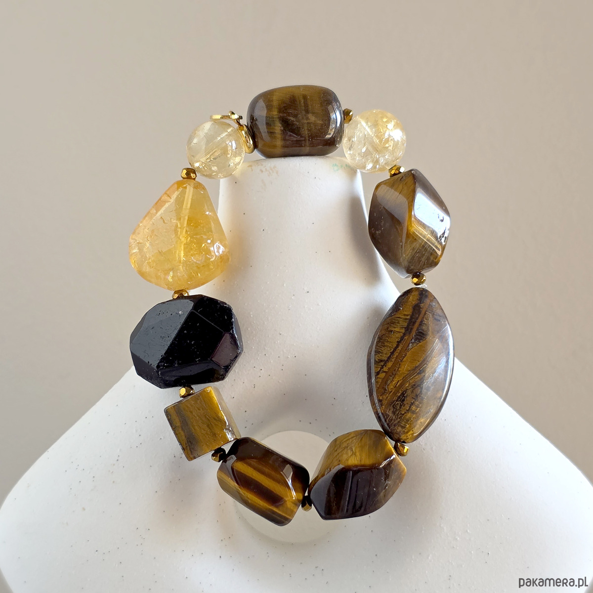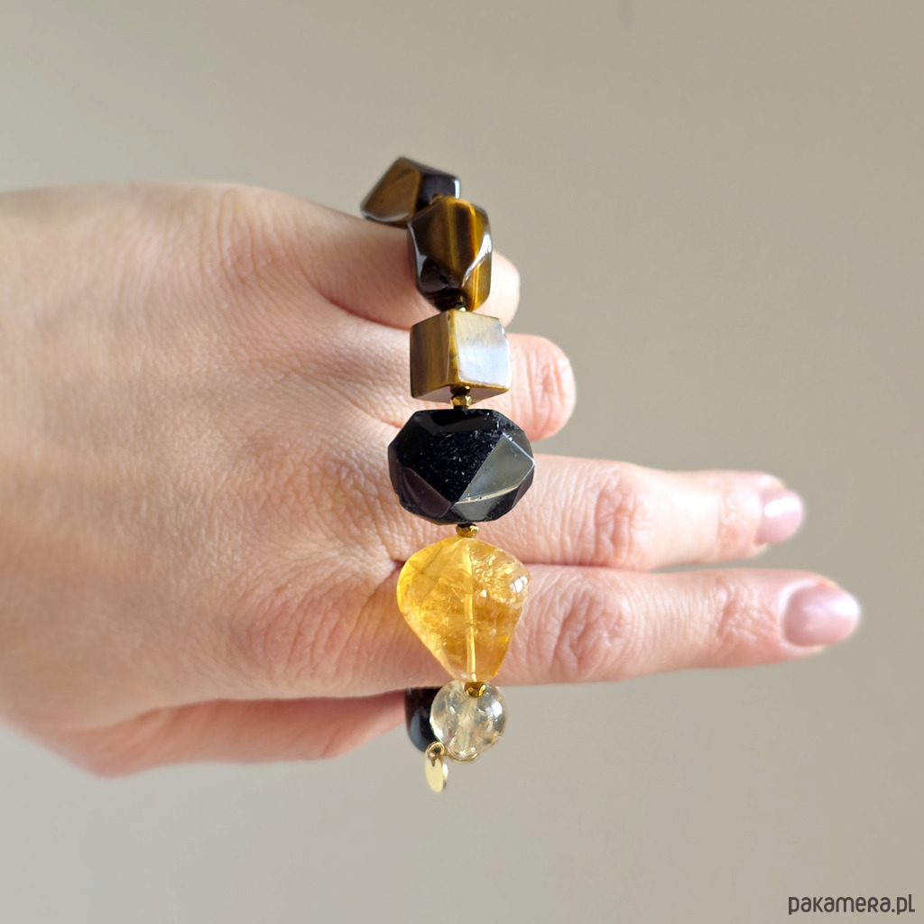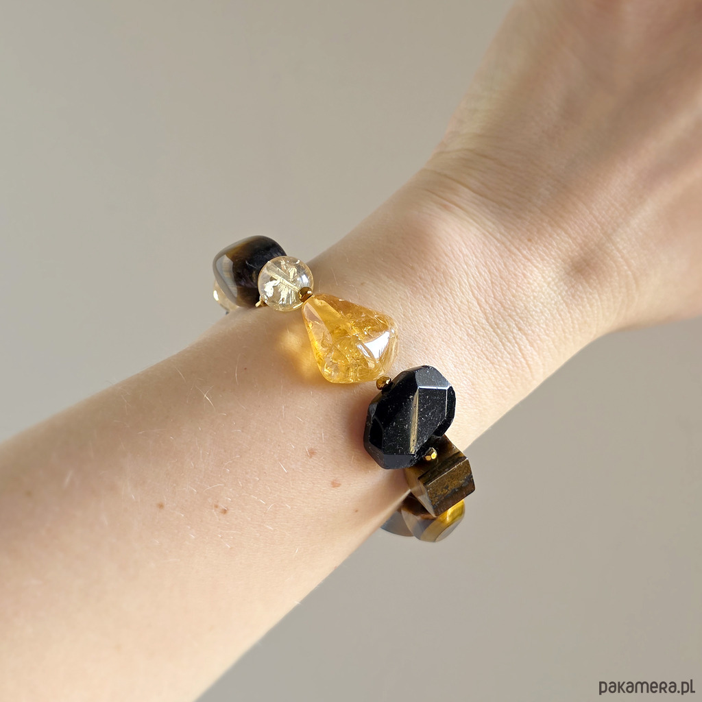 Bransoletka wykonana z kamieni naturalnych - czarnego turmalinu, cytrynu (prażony), tygrysiego oka i hematytu oraz mocnej gumki jubilerskiej. Bransoletka będzie odpowiednia na nadgarstek o obwodzie 15,5-16,5 cm.