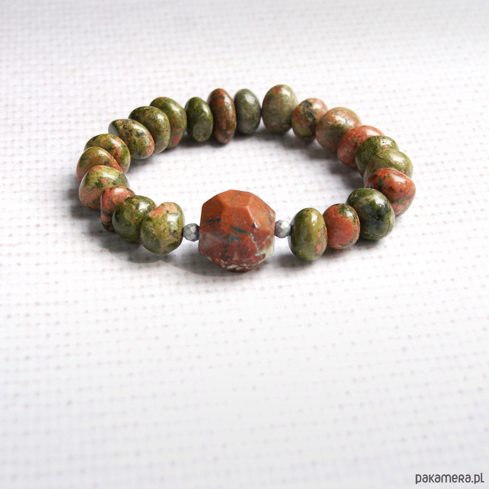 cudna bransoletka wykonana z nieregularnych nuggatów unakitu oraz idealnie pasującej, unikatowej, ciosanej bryłki ryolitu (ok.20mm), umieszczonej pomiędzy dwoma kuleczkami matowego hematytu.