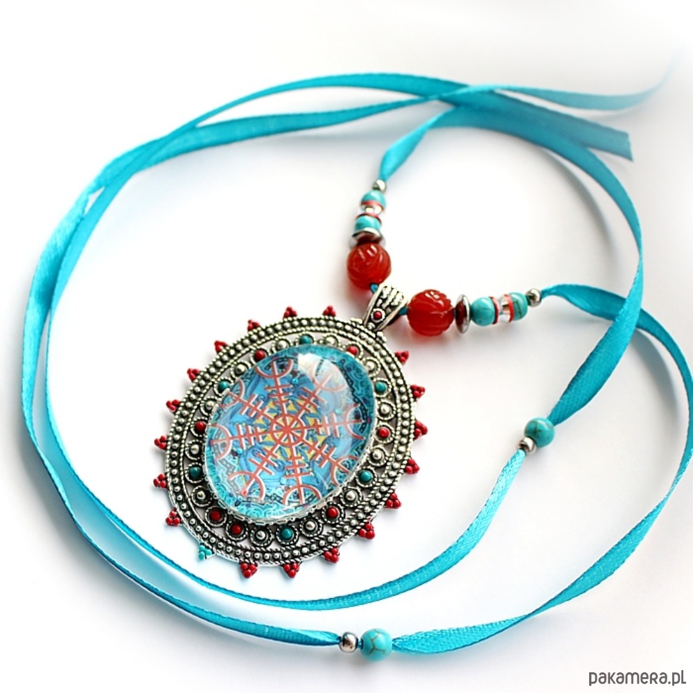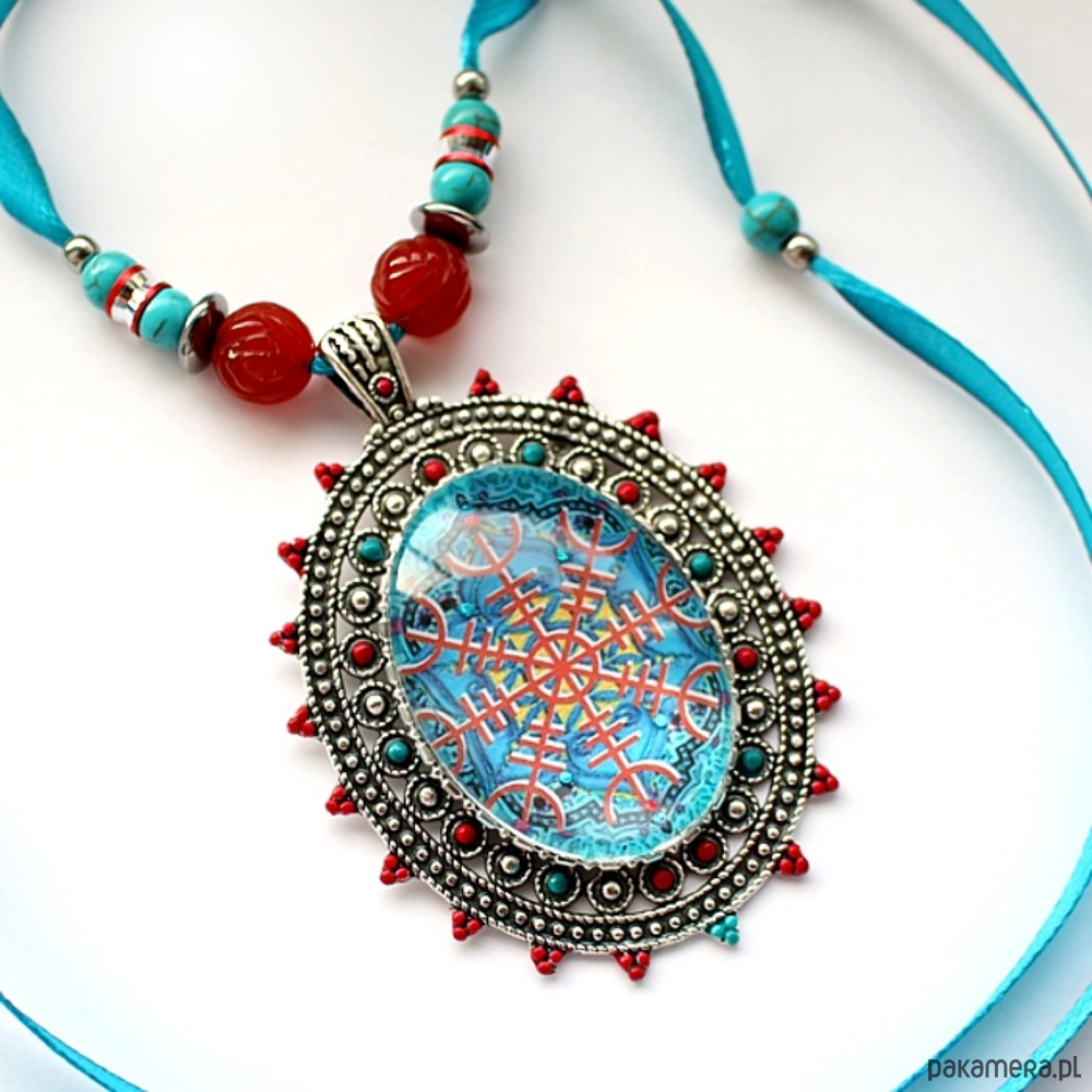 Autorski wisior amulet ochronny na ażurowej bazie w odcieniu antycznego srebra, ręcznie malowanej, ozdobionej szklanym kaboszonem z oryginalną marokańską mozaiką z Fezu z motywem tarczy algizowej Aegishjalmur, z kolekcji autorskich prac fotograficznych KEIT. Umocowany na satynowej wstążce ozdobionej ręcznie rzeźbionymi różami w karneolu, turkusami i hematytami.