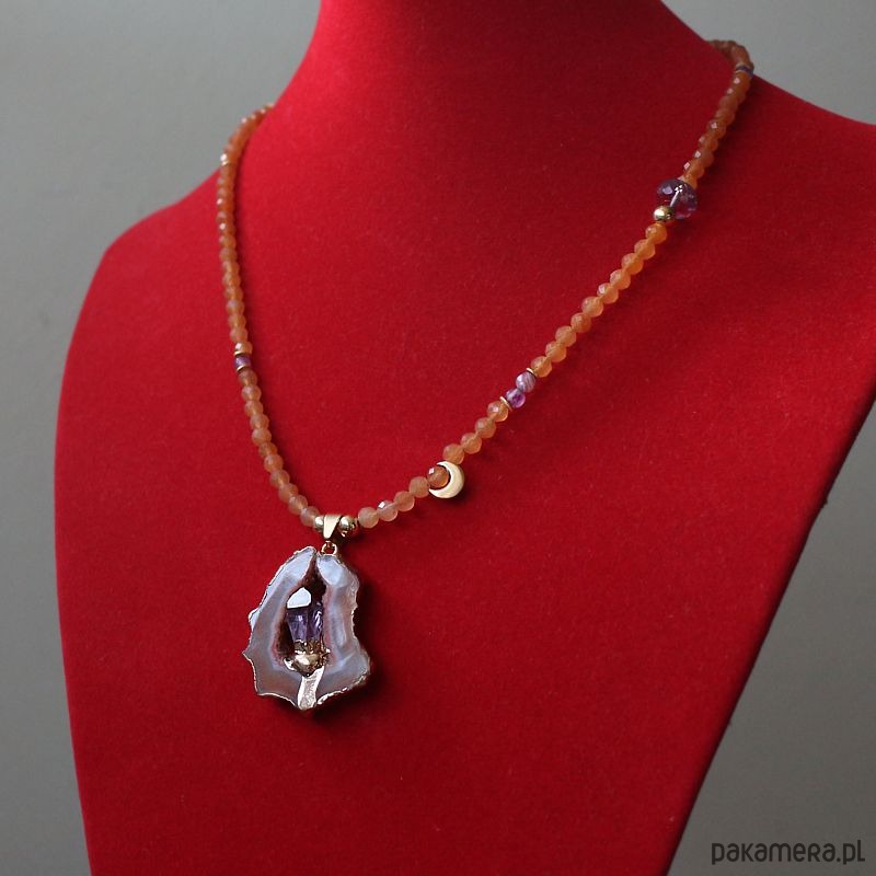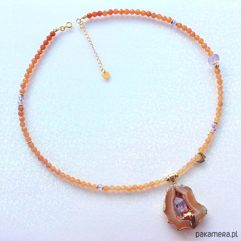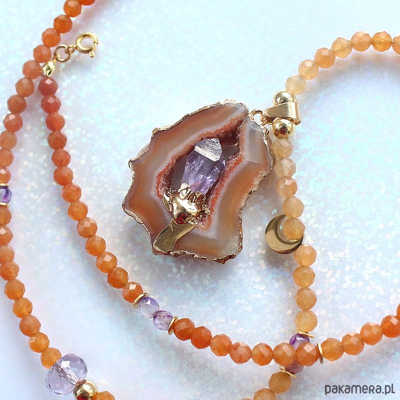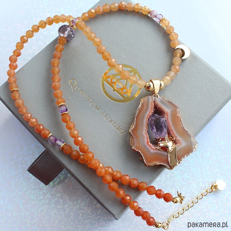 Autorski elegancki energetyczny naszyjnik z fasetowanym kamieniem słonecznym, z przepiękną druzą agatu ognistego z wkomponowanym ametystem, w oprawie pozłacanej 24k złotem i przekładkami ze srebra próby 925 pozłacanej 24k złotem.