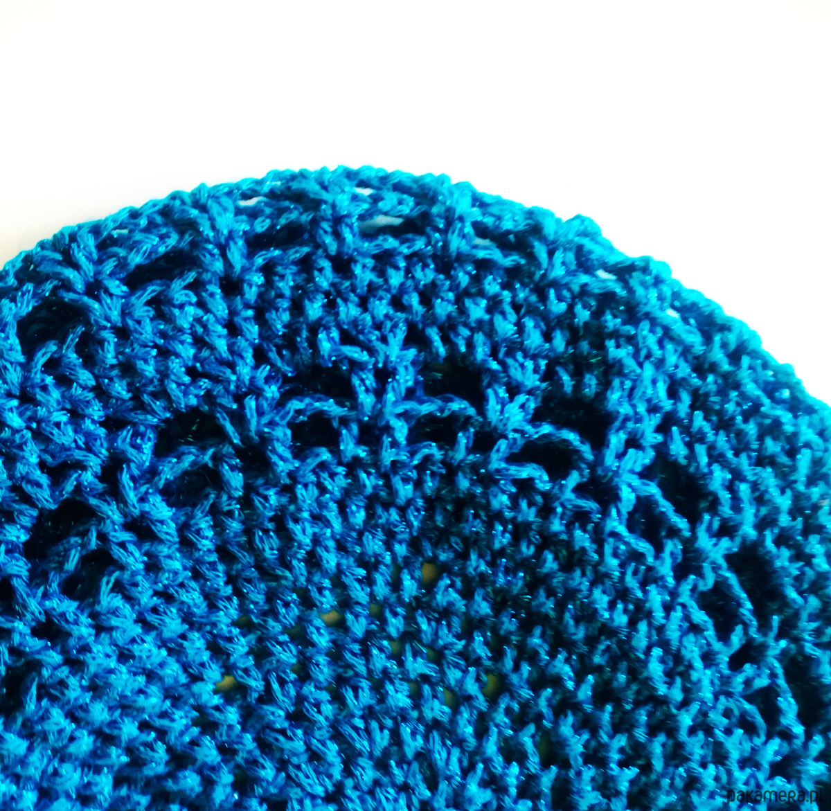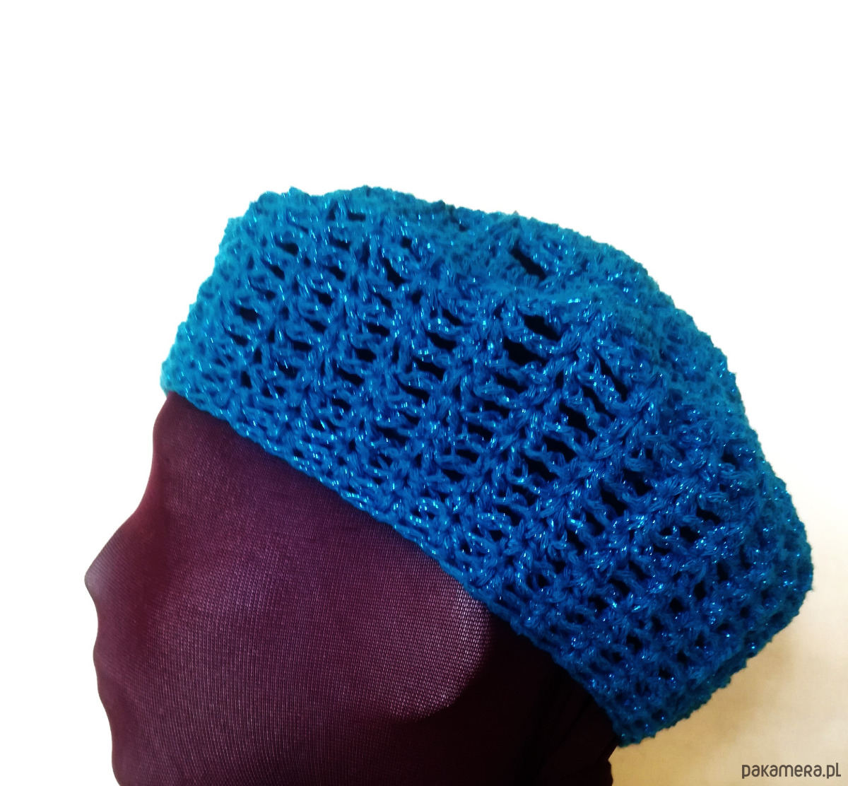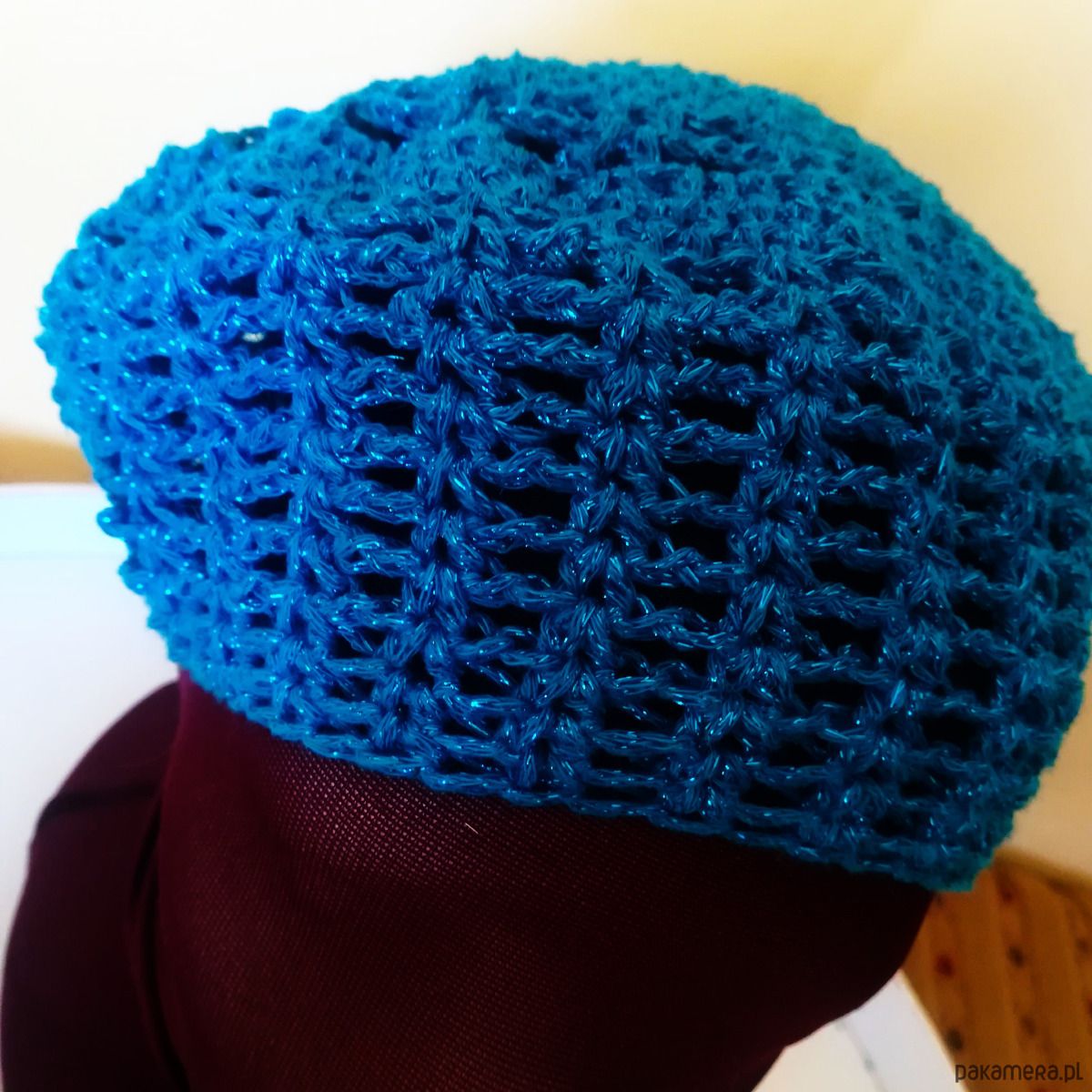Unikatowa mała czapka, ręcznie zrobiona na szydełku z bawełnianej włóczki z błyszczącą nitką Ścieg ażurowy,prosta p forma dobrze układająca się na głowie. Do łączenia z wiosennymi ubraniami w stylu casual, eleganckimi oraz party.