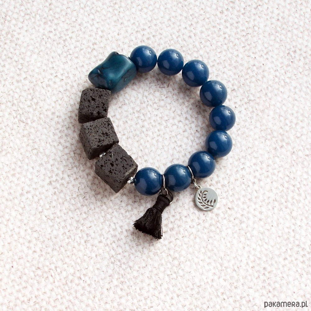 bransoleta na solidnej gumce jubilerskiej. stworzona z jadeitu w głębokim kolorze teal (DUŻE kule 14mm), niebieskiego korala, czarnej, porowatej lawy wulkanicznej 16mm, drobnego chwościka i zawieszki ze stali szlachetnej (nie uczula, kolor nie ściera się).