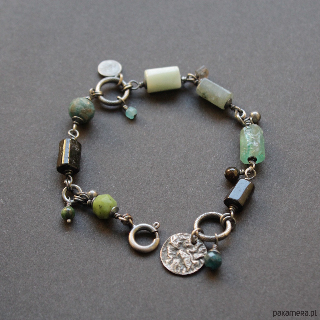 Bransoletka UNIKAT wykonana została z oksydowanego srebra próby 925 oraz minerałów: