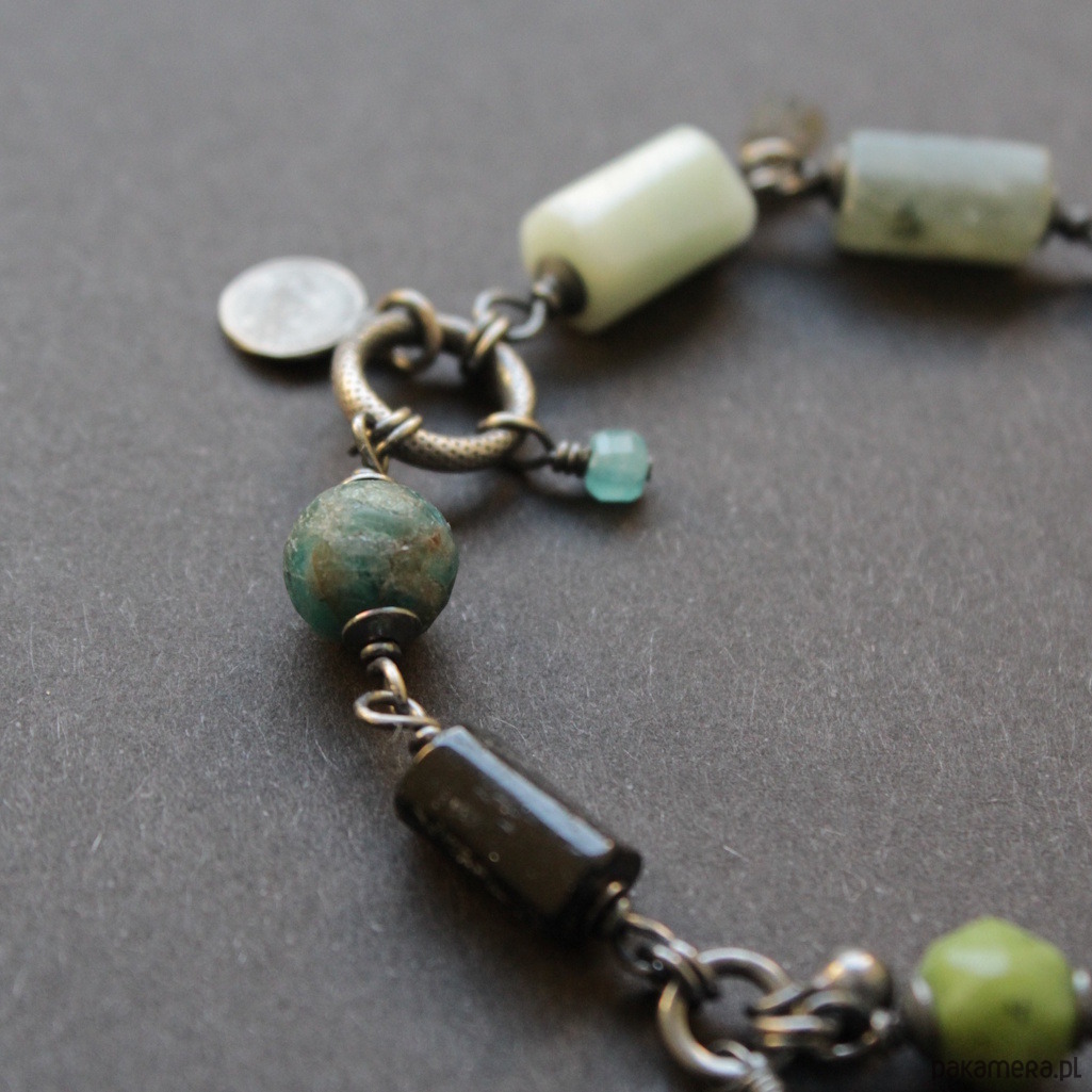Bransoletka UNIKAT wykonana została z oksydowanego srebra próby 925 oraz minerałów: