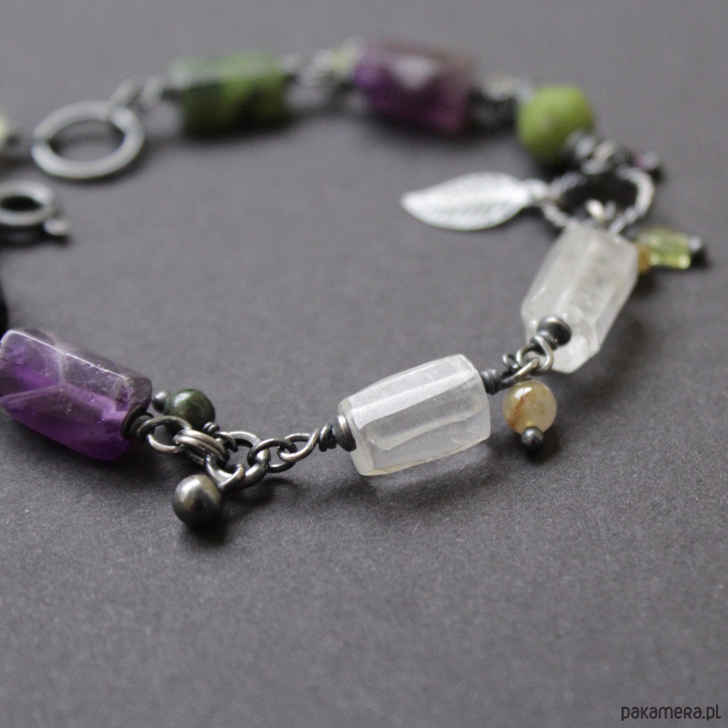 Bransoletka UNIKAT wykonana została z oksydowanego srebra próby 925 oraz minerałów: