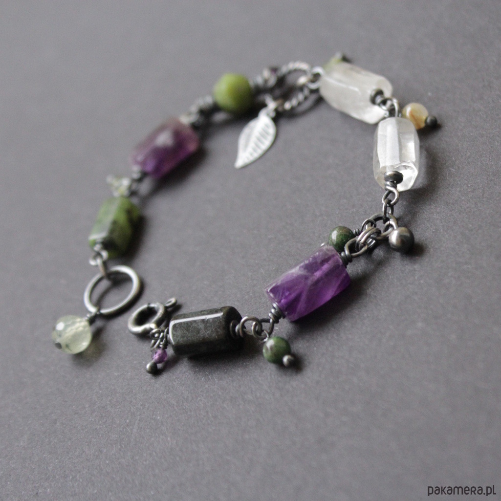 Bransoletka UNIKAT wykonana została z oksydowanego srebra próby 925 oraz minerałów: