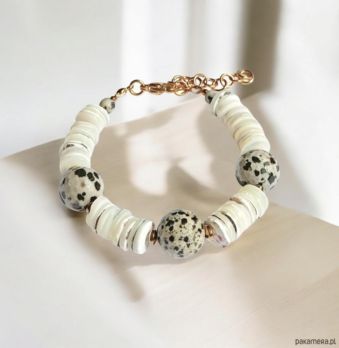 UNIKATOWA bransoletka: muszla kremowa i jaspis dalmatyński